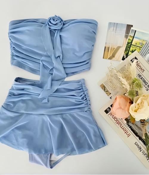 スイート系無地オフショル立体フラワー付き・リボン&フリルデザイン ビキニ風セパレート水着 HMZ7-SNM35014