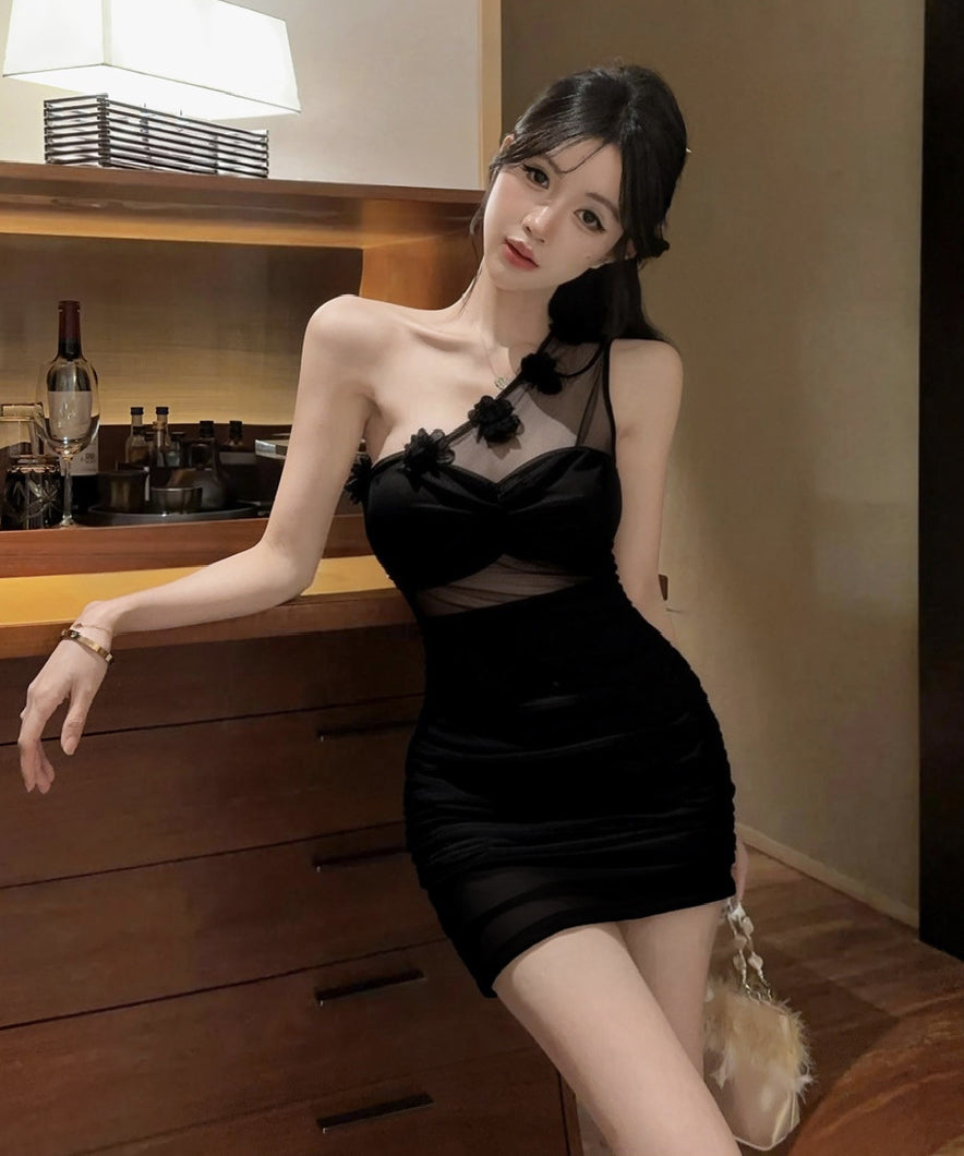 【3色】ミニドレス キャバドレス セクシー チュール ワンショルダー ボディコン フラワーモチーフ クラブ 指名 JC2-DD3993