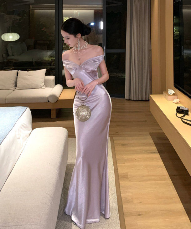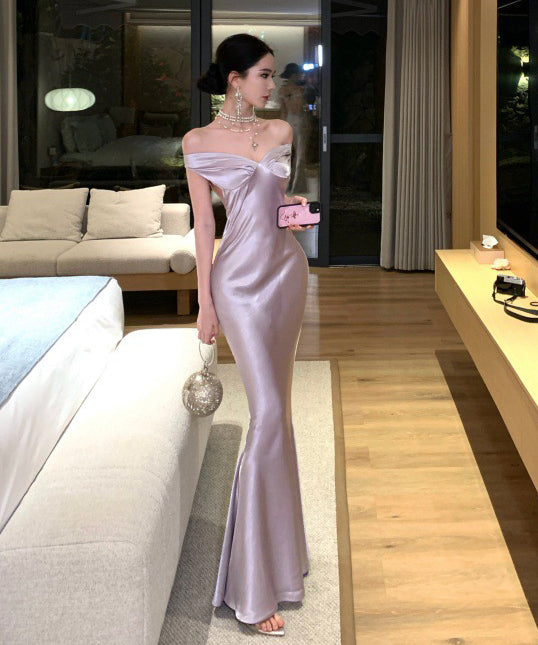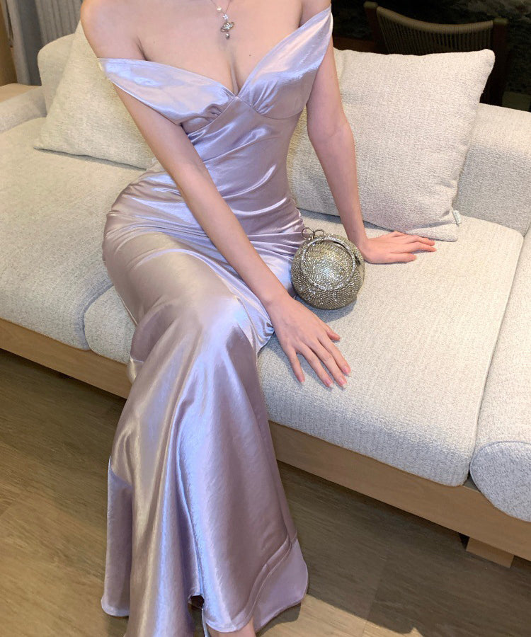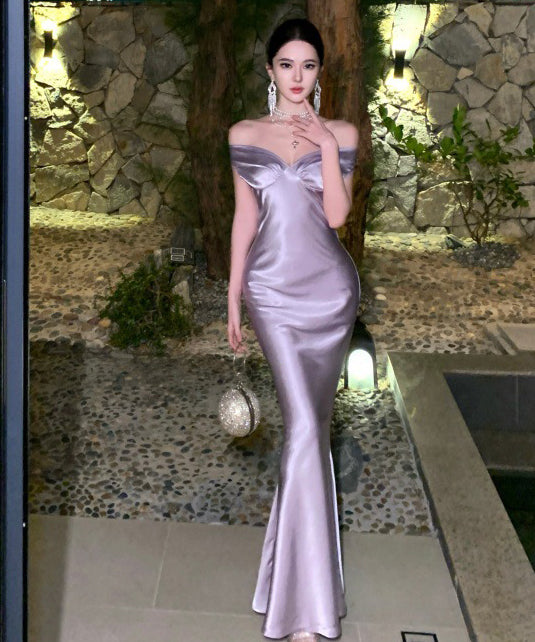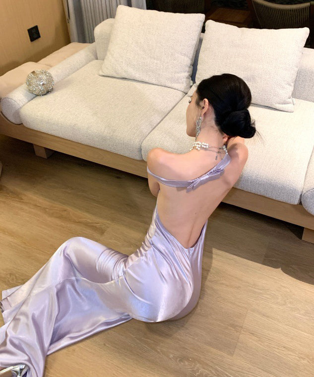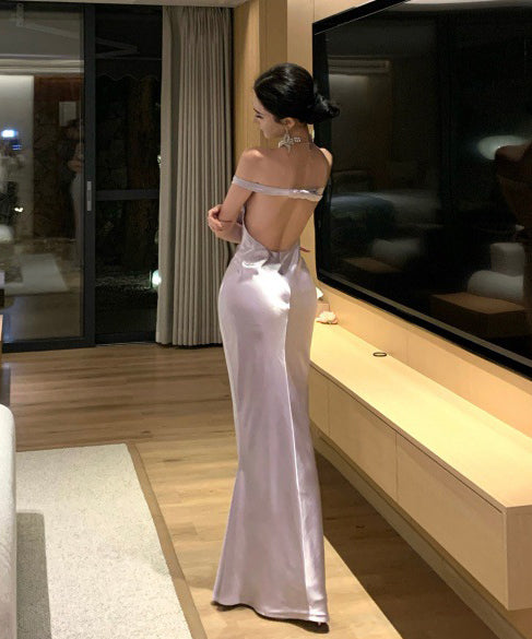 ロングドレス キャバドレス セクシー バックレス リボンデザイン リボンデザイン ツヤ感 オフショルダー サテン パーティー JC2-XHY918302