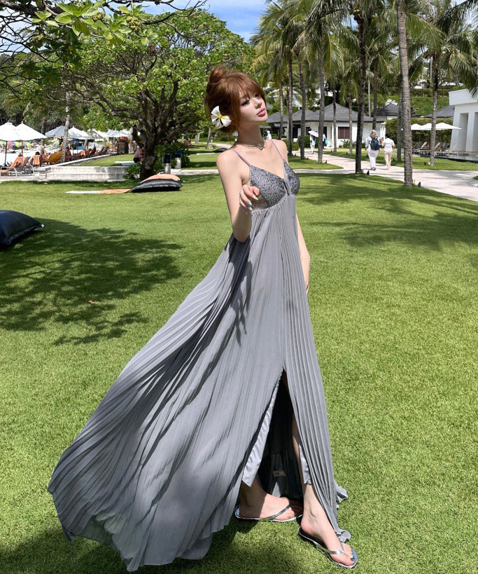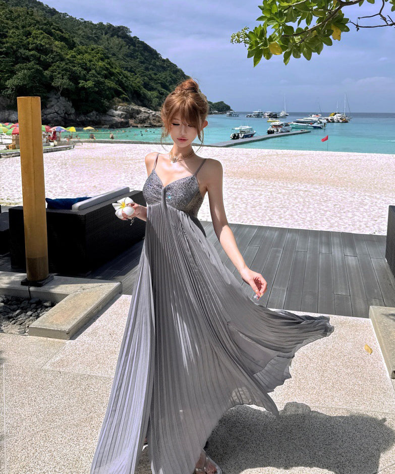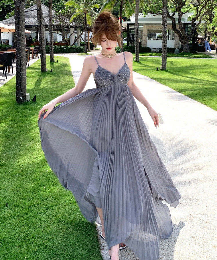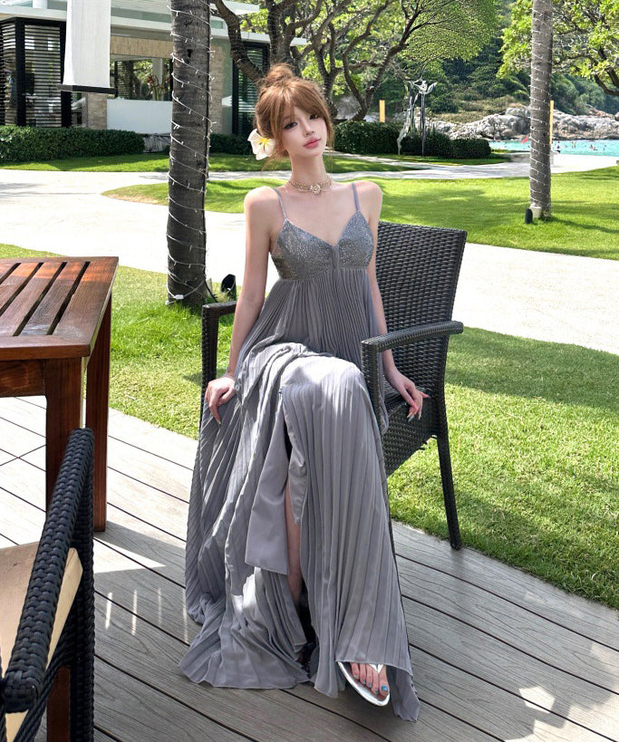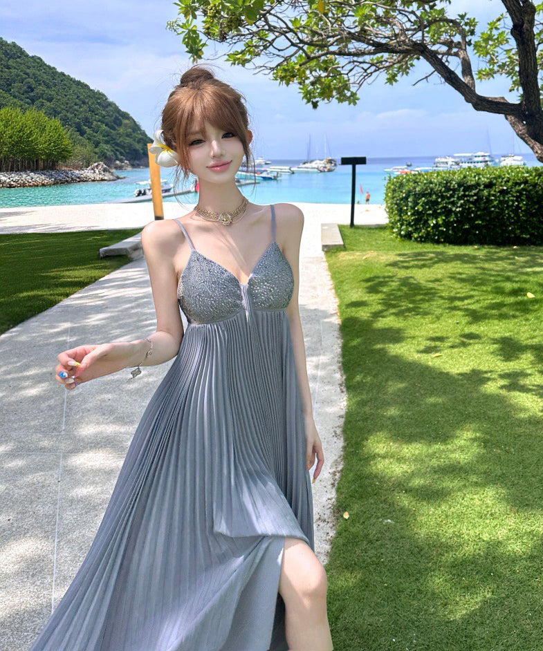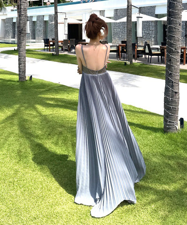 ロングドレス キャバドレス セクシー ビジュー付き Vネック バックレス キャミソール フレアシルエット プリーツ加工 バースデー JC2-XHY911117