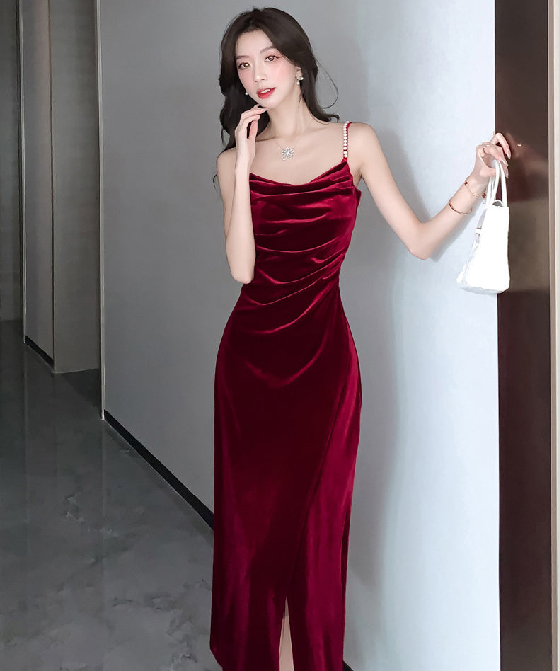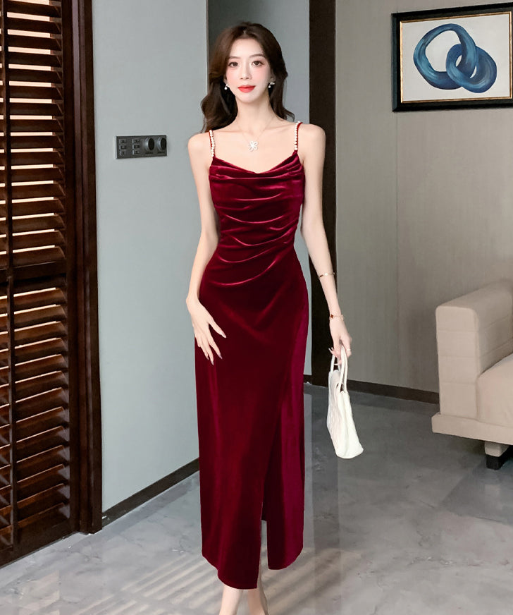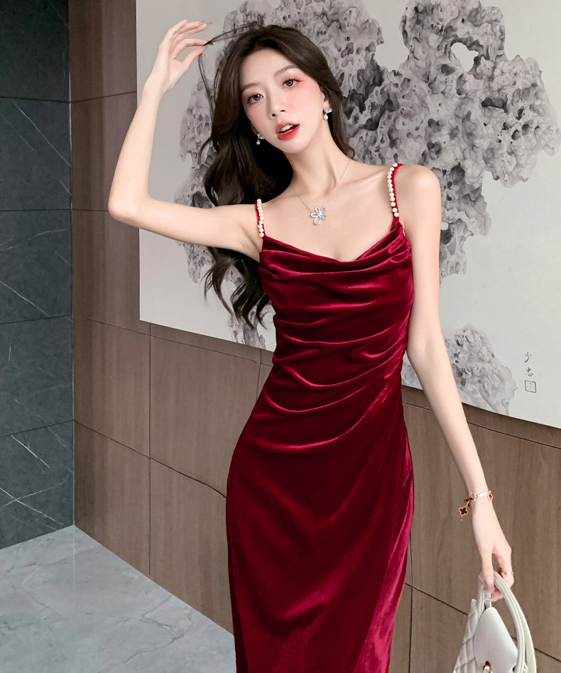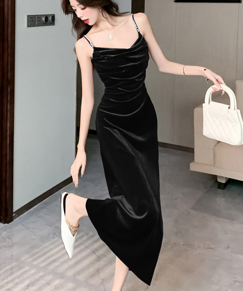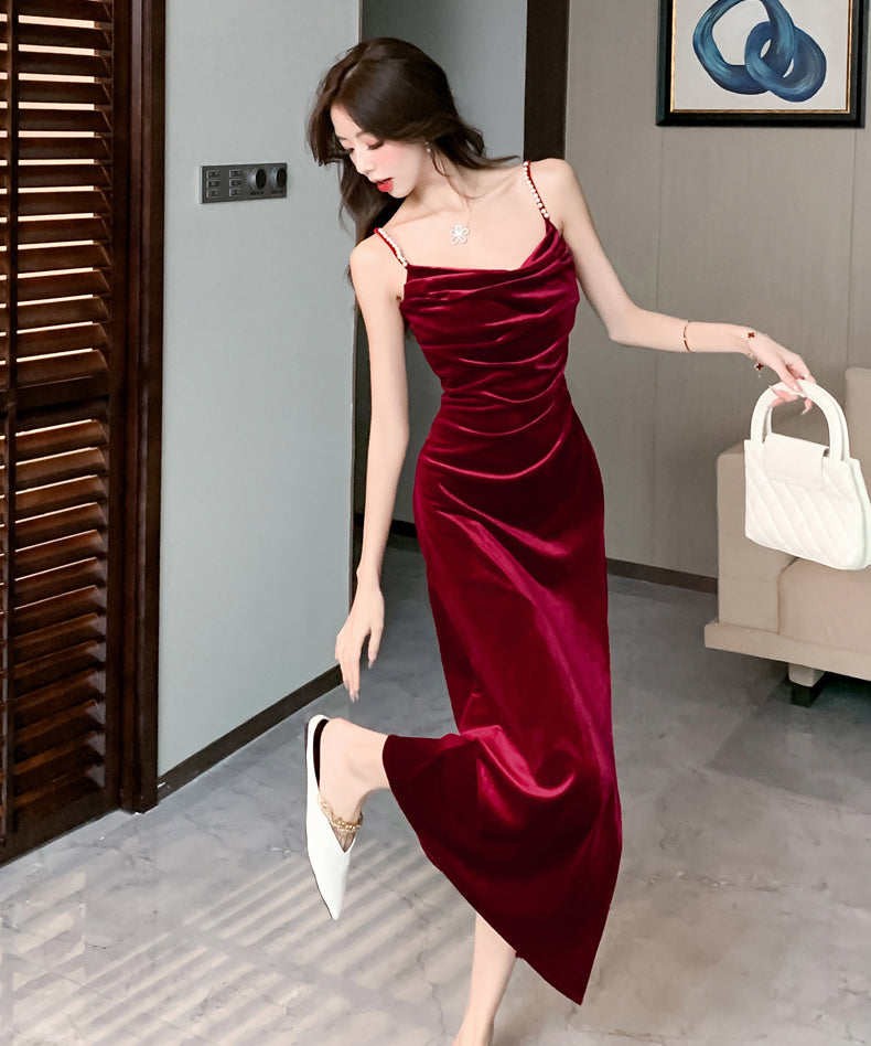 【2色】ロングドレス キャバドレス セクシー キャミワンピース パールストラップ ベロア素材 フレンチガーリー ウエストマーク 細見え 大人可愛い LW2-OYF655#6505##50