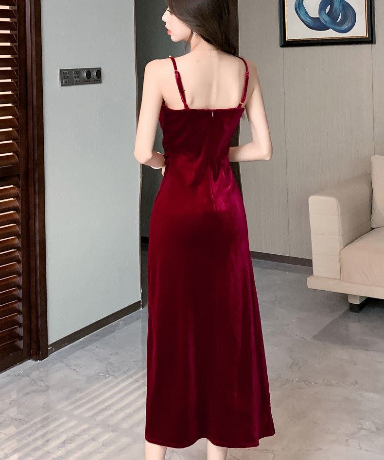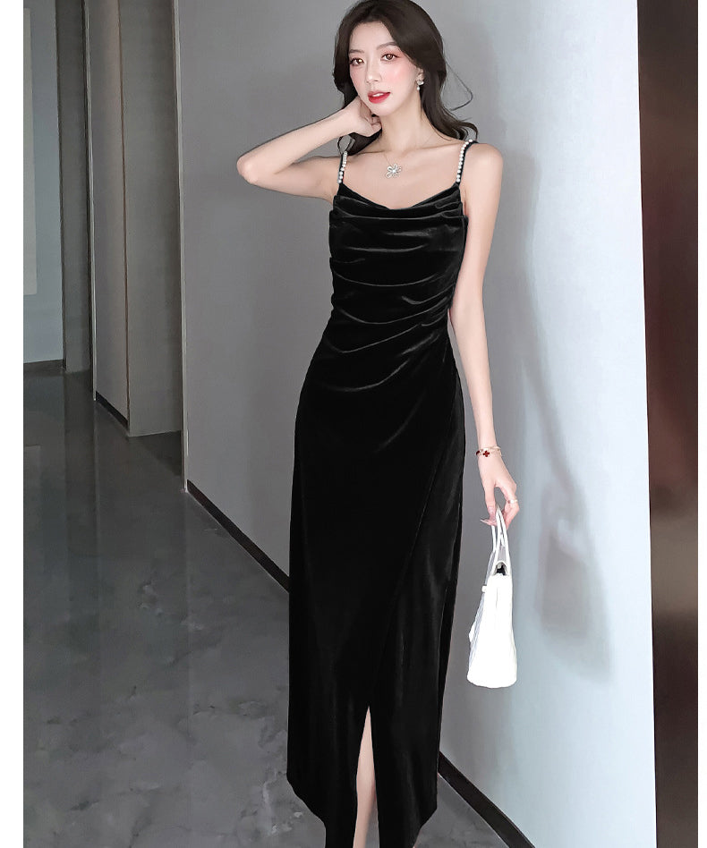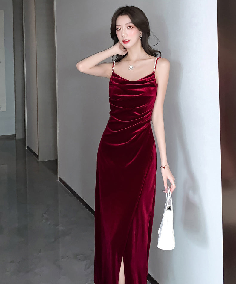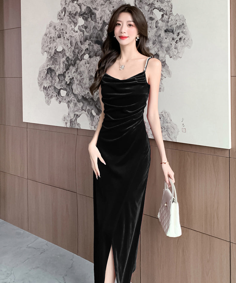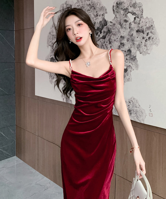 【2色】ロングドレス キャバドレス セクシー キャミワンピース パールストラップ ベロア素材 フレンチガーリー ウエストマーク 細見え 大人可愛い LW2-OYF655#6505##50
