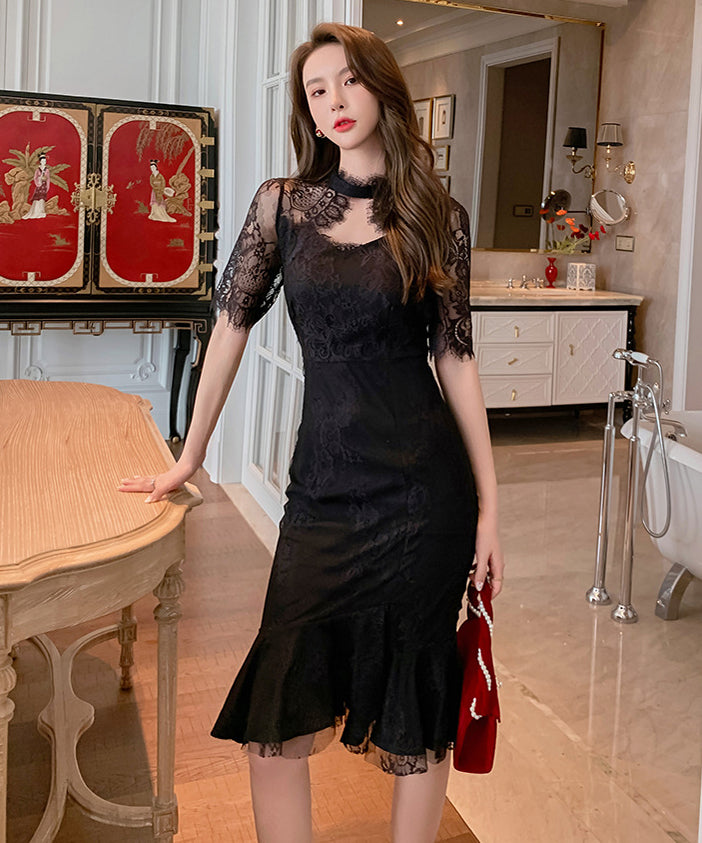 2色 膝丈ドレス 刺繡 レース セクシー 着瘦せ レトロ調 透かし彫り XH2-JY4931