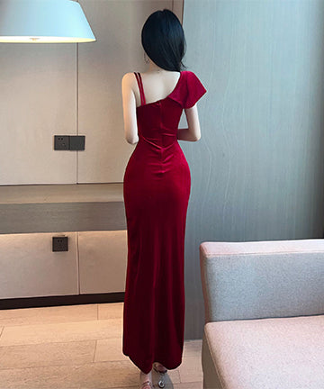 【2色】ロングドレス 非対称 谷間魅せ セクシー 宴会 スリット 脚長効果 XH2-MLS7645