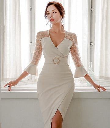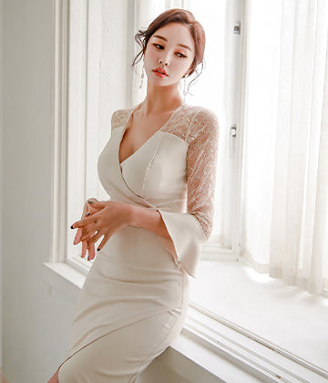 Vネック ひざ丈ドレス ゴージャス レース 高級感 二次会 LT2-ZED889060BM131