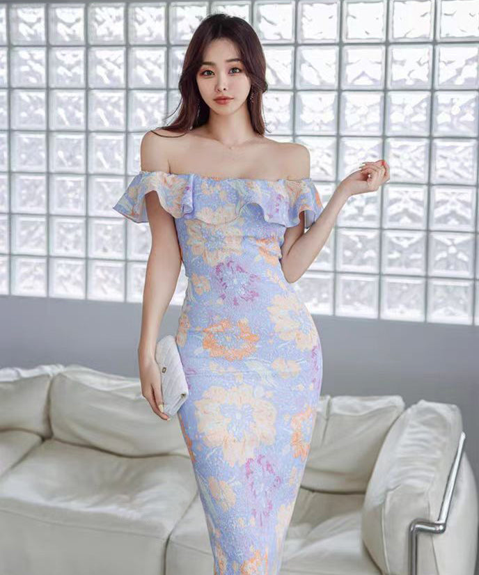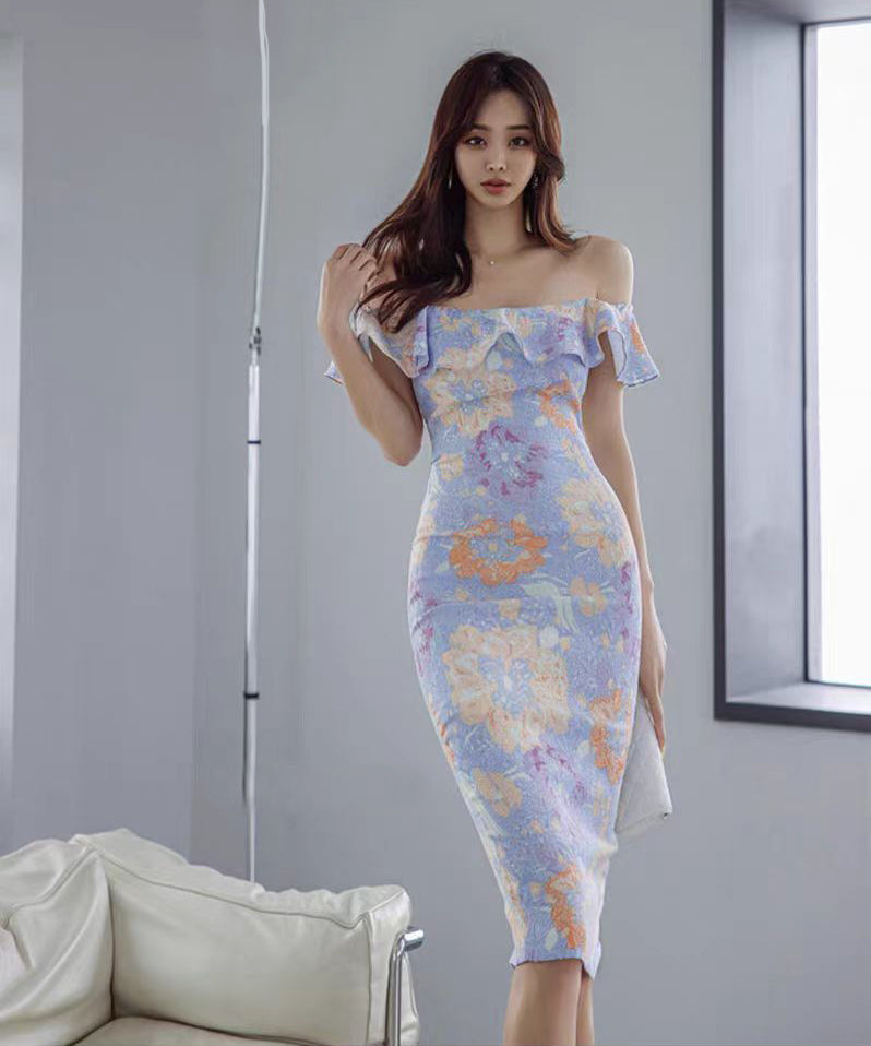 キャバドレス 膝丈ドレス かわいい セレブ風 おしゃれ 花柄 ワンショルダーYH2-ZED886704BH506