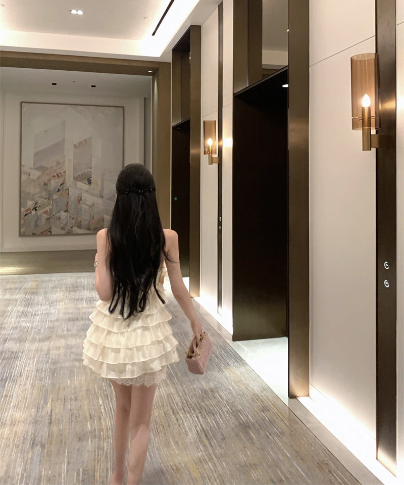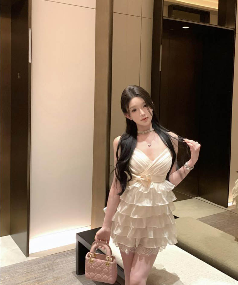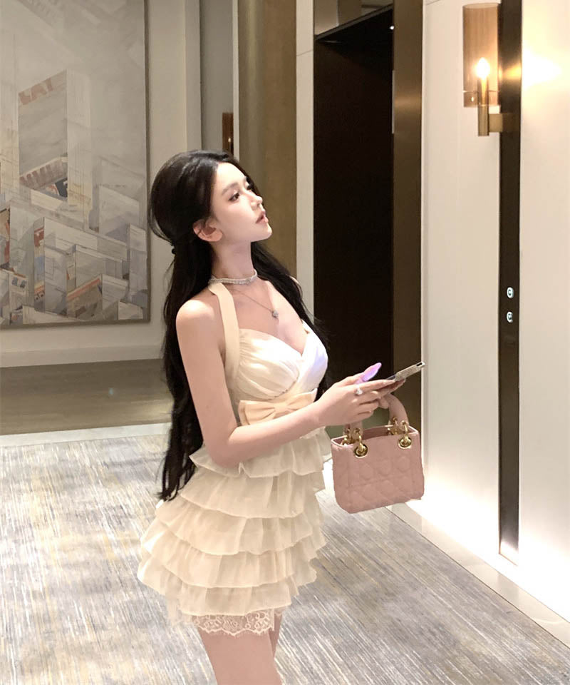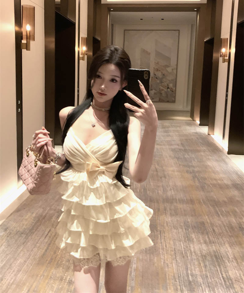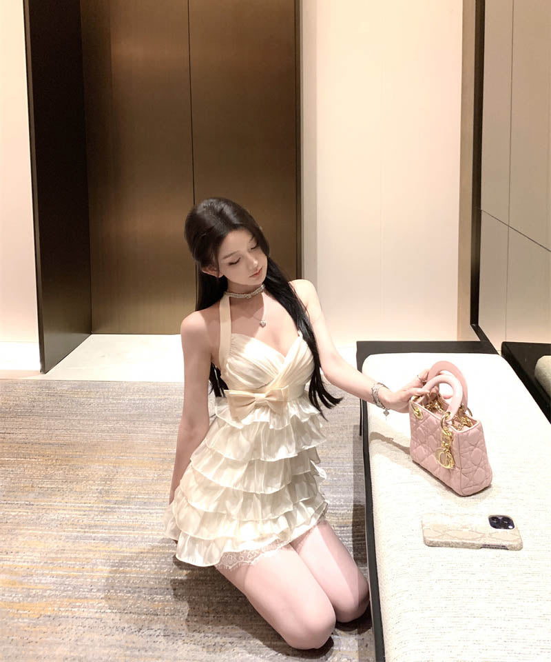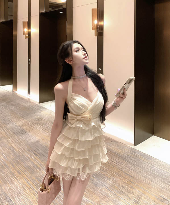 ティアードスカートミニドレスホルターネックカワセクシーパーティー誕生日パーティーリボン手作りドレスセクシー谷間見せ WQ2-XKD-D318A-6304-Apr9