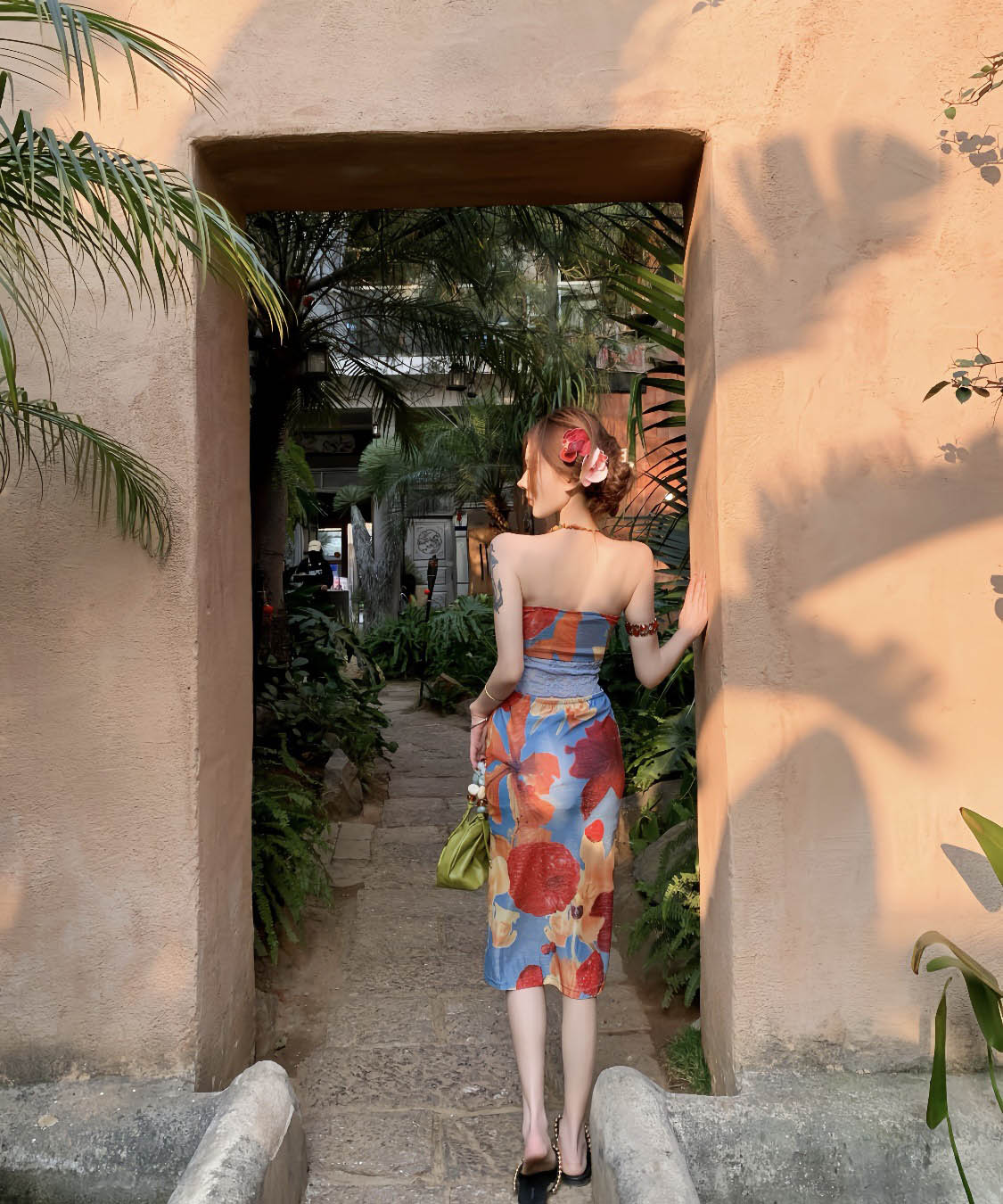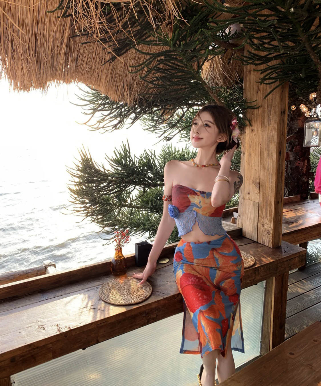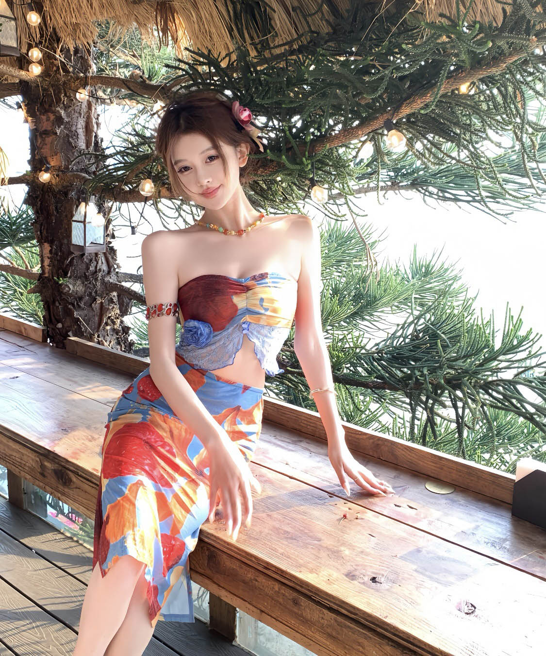ビキニ水着ワンピース油絵柄ベアトップフリル大人可愛いビキニ水着温泉 WQ7-CF-AD35032
