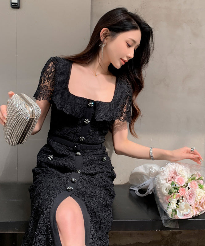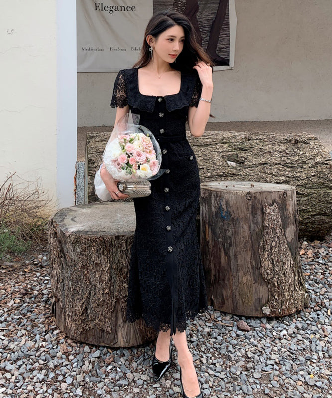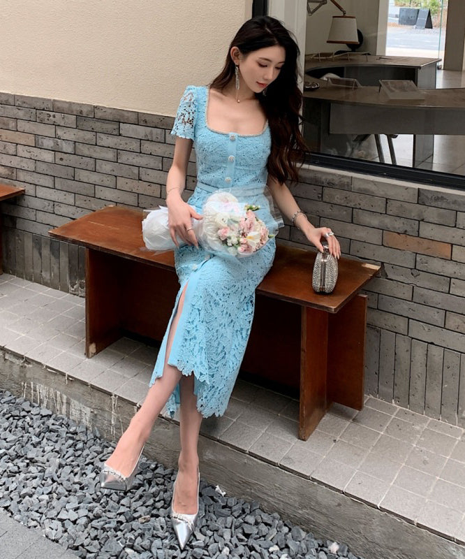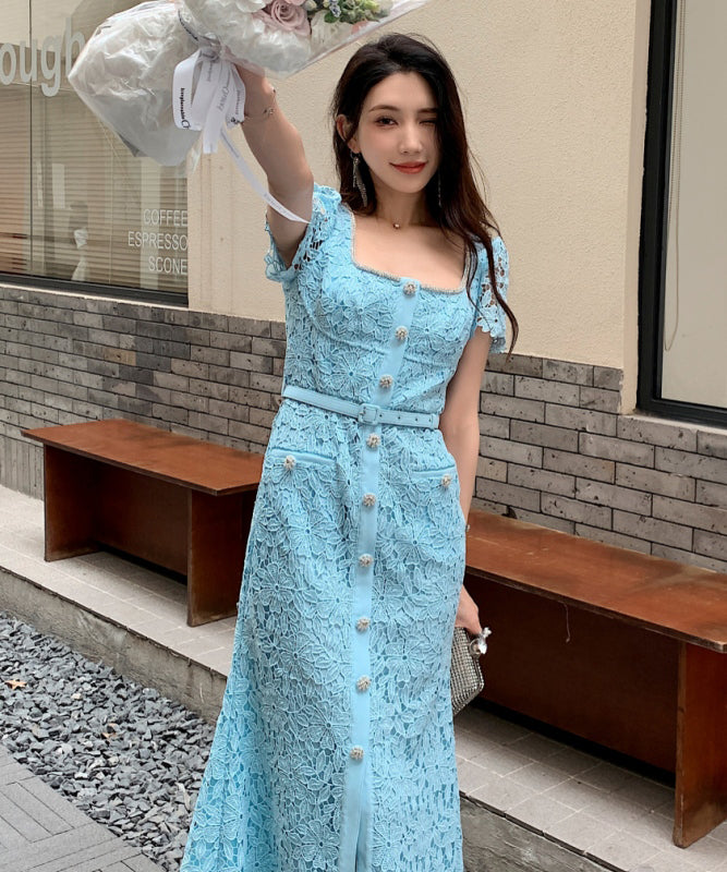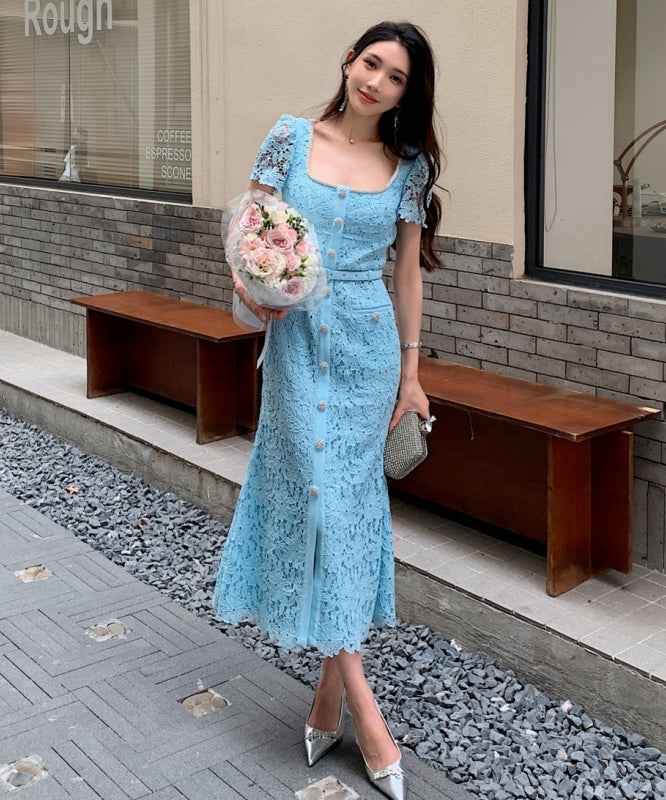 【ブルー&ブラック】手作り Aラインドレス 総レースドレス セレブ風 キラキラ イベントドレス デートディナー 誕生会ドレス XH2-NN-SS24-004