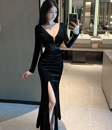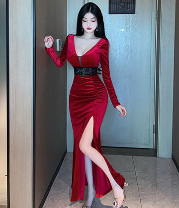 ベロア ロングドレス キャバドレス 着痩せ 谷間魅せ 脚長効果 セクシー 披露宴 LT2-MLS7629