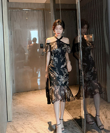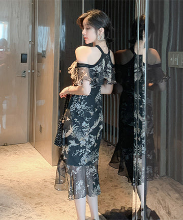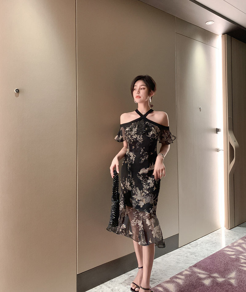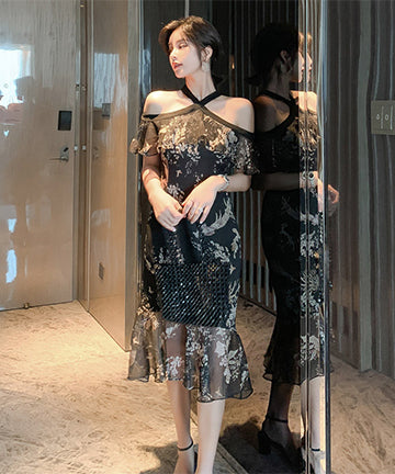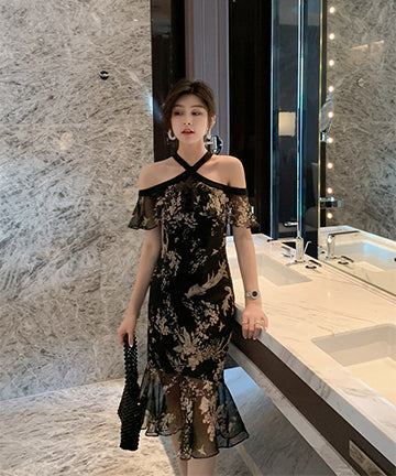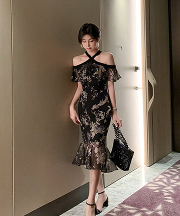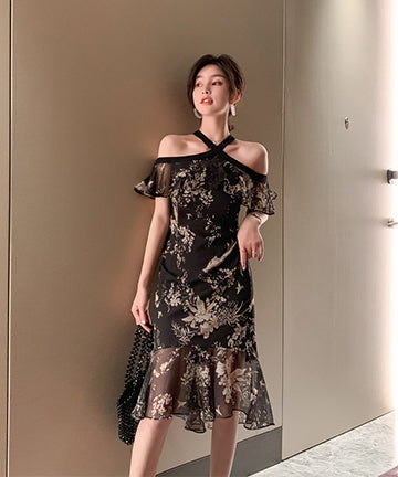 ホルターネック チュール 花柄 フリル 淑やか セクシー XH2-JY1938