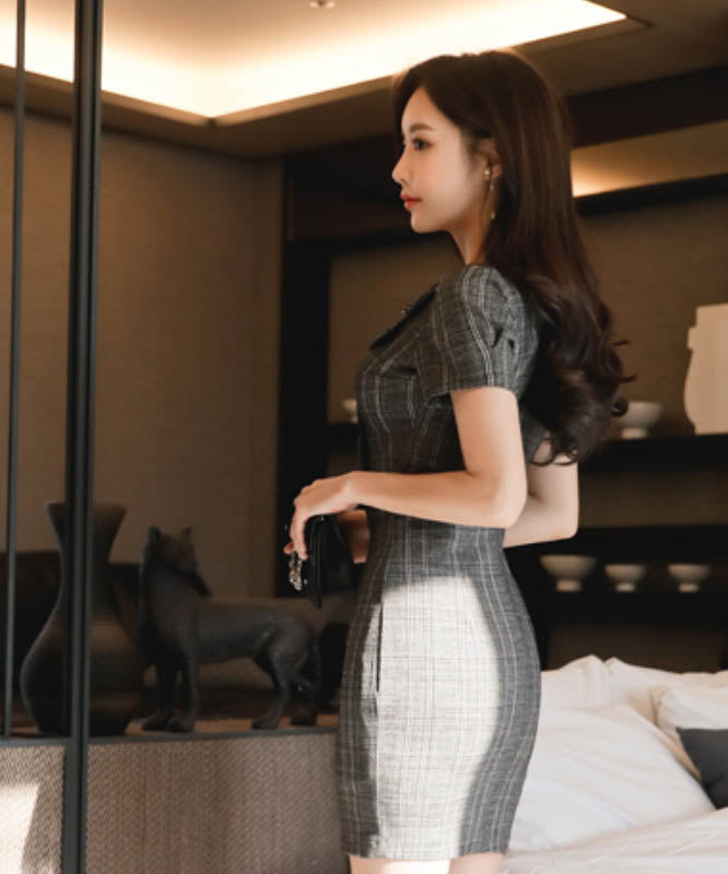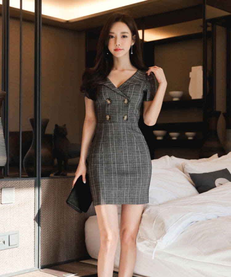 ミニドレスキャバドレスチック柄エレガントVネック小顔谷間見せ通勤エレガントタイトドレス WQ2-ZED889693A71