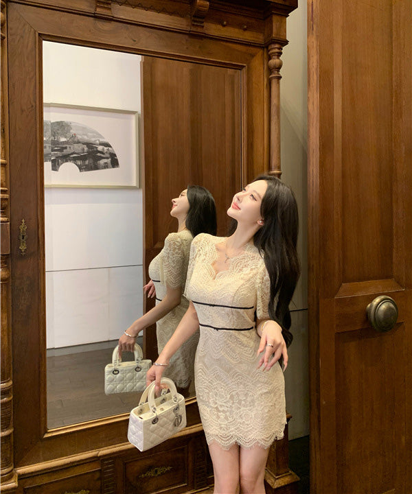 ミニドレスキャバドレスレースパフスリーブかわいい気質女子力着痩せ韓国っぽ通勤同伴 WQ2-XKD-D452-1037-Mar2