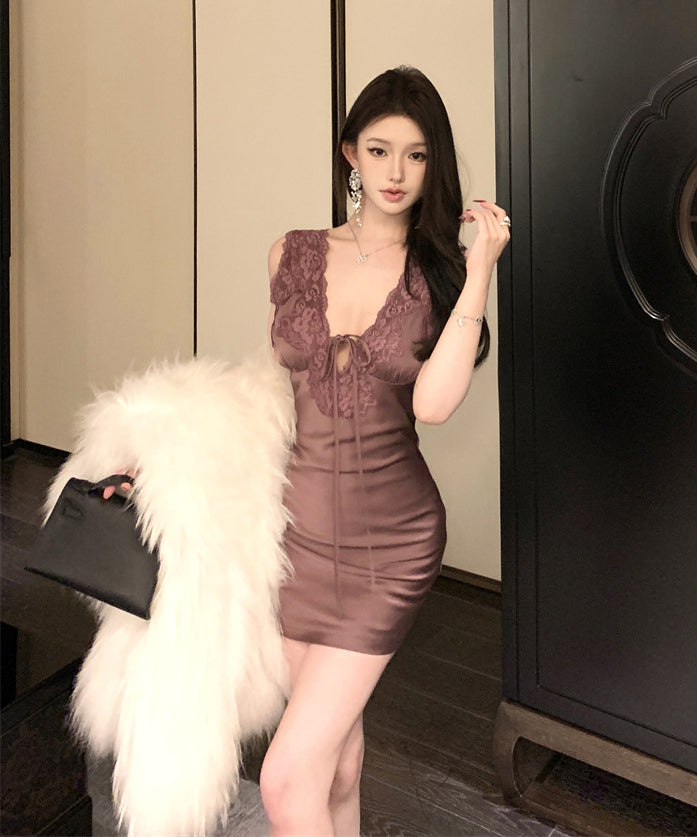 ミニドレスキャバドレスレースVネック谷間見せセクシーナイトクラブ指名気質XH2-XKD-D308-6920-Dec14