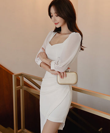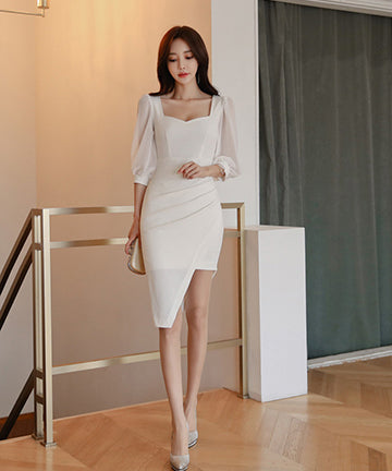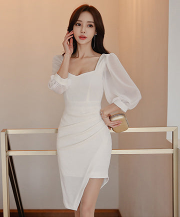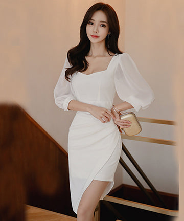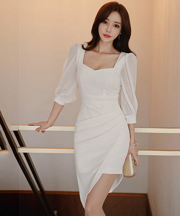 ミニドレスス クエアネック セクシー パフスリーブ エレガント 非対称 XH2-ZED886535BH506
