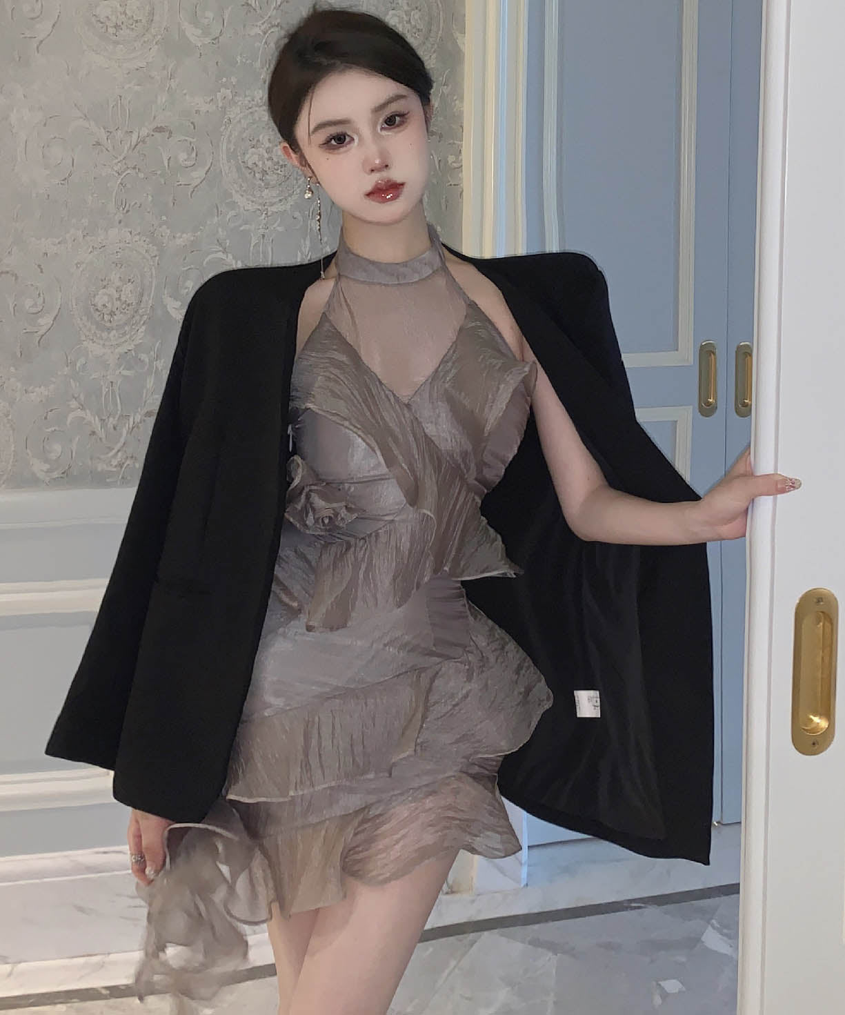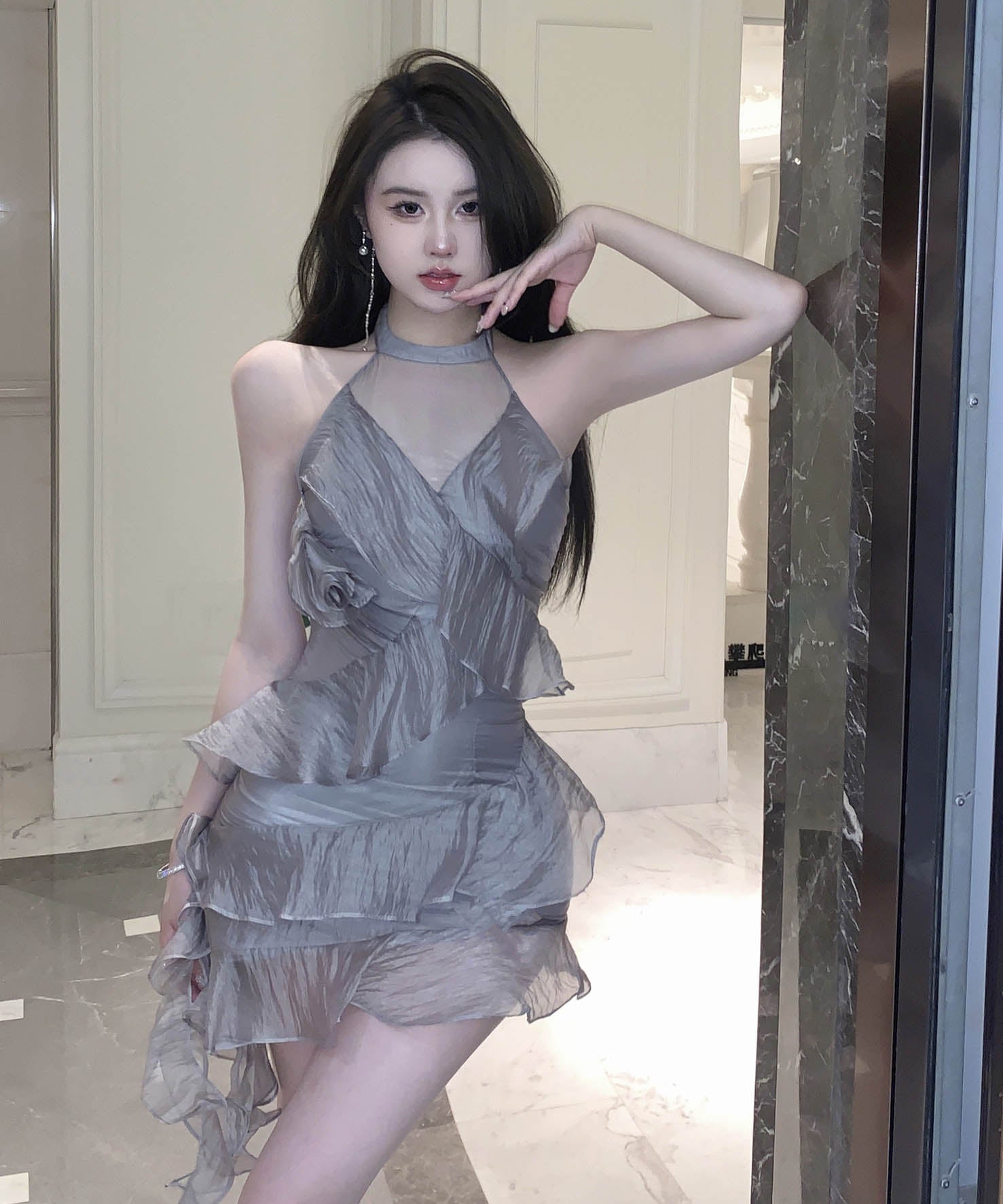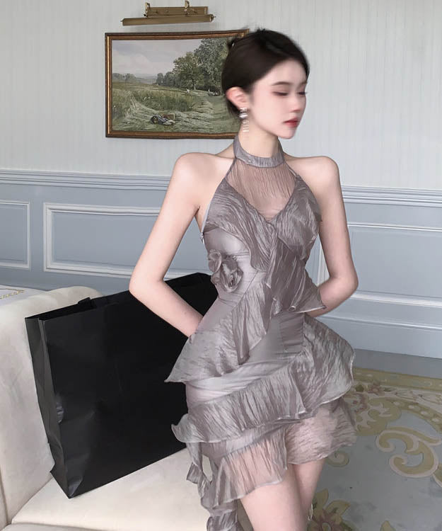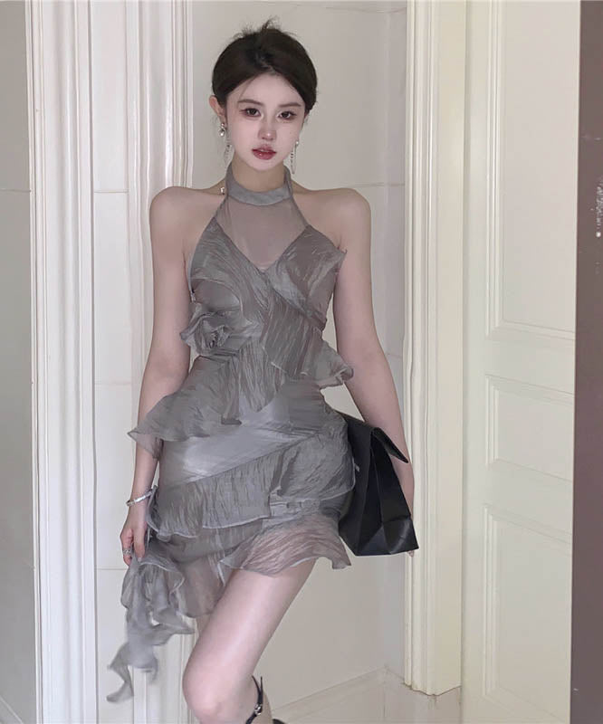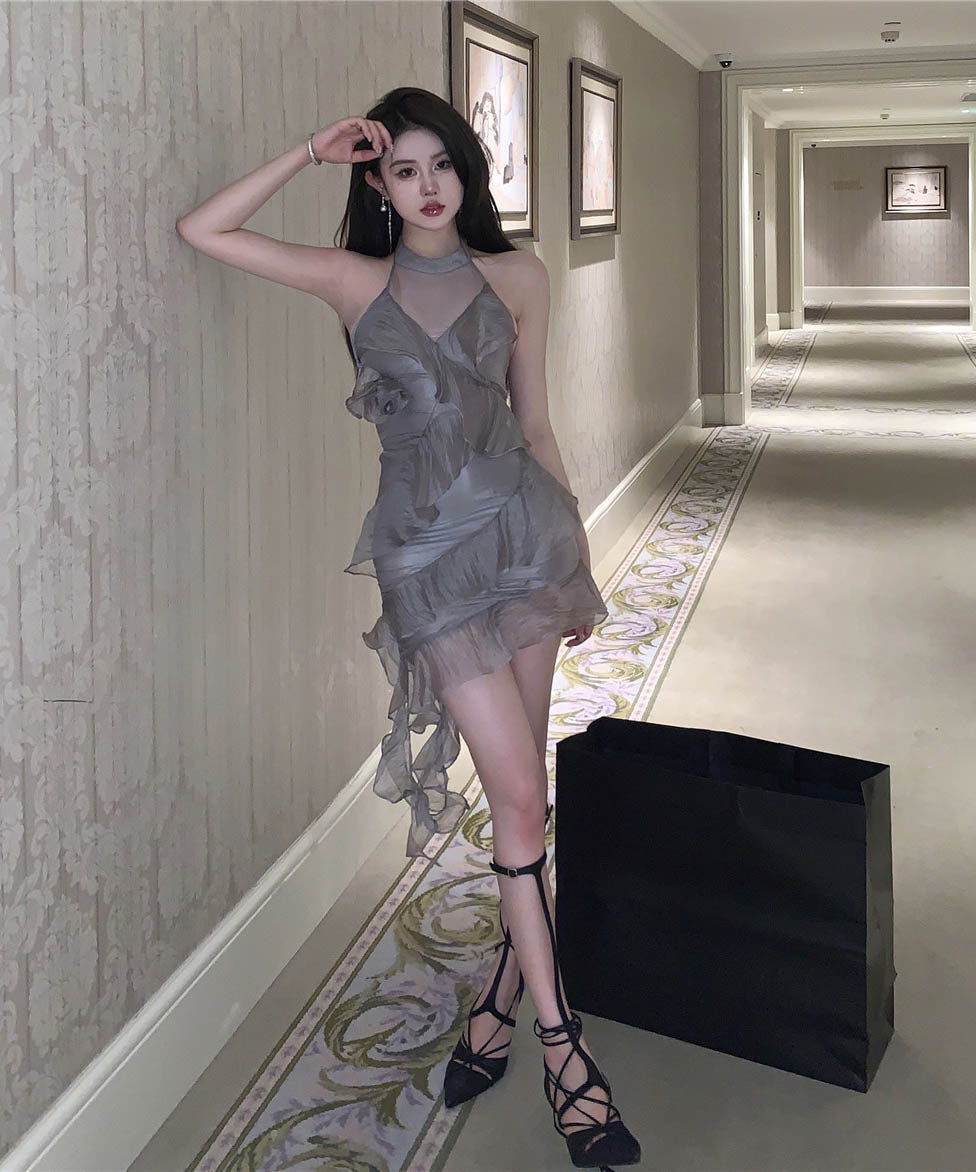 ミニドレスホルターネックチュール大人可愛いフリル非対称パーティー気質フランス風 WQ2-SJHY-X4699