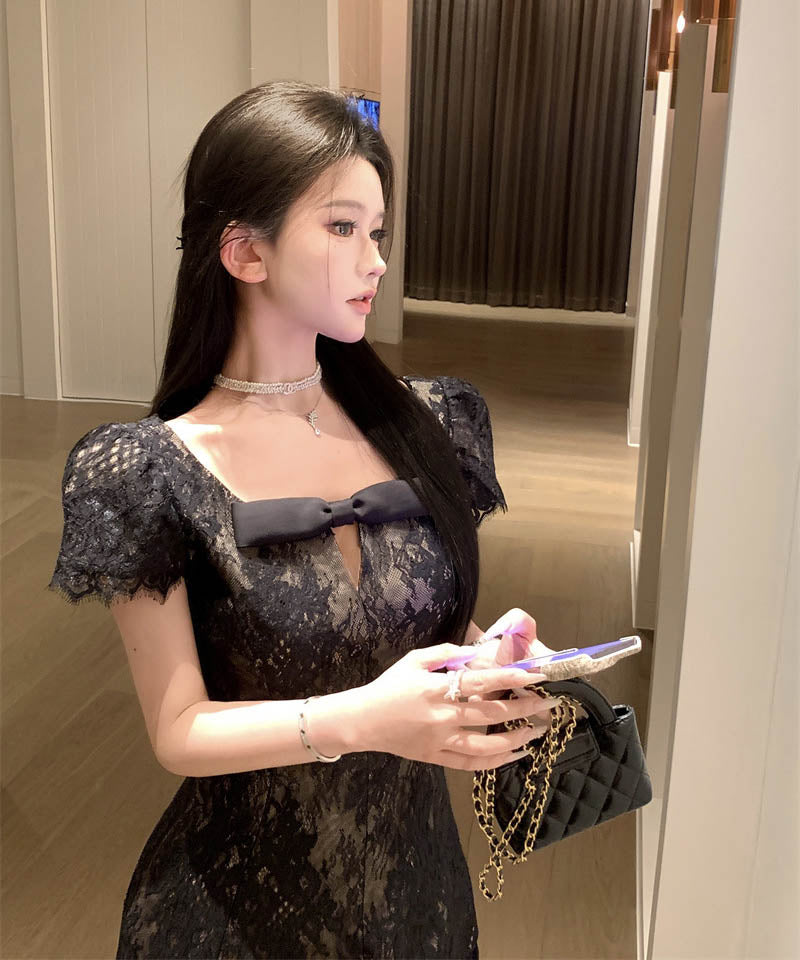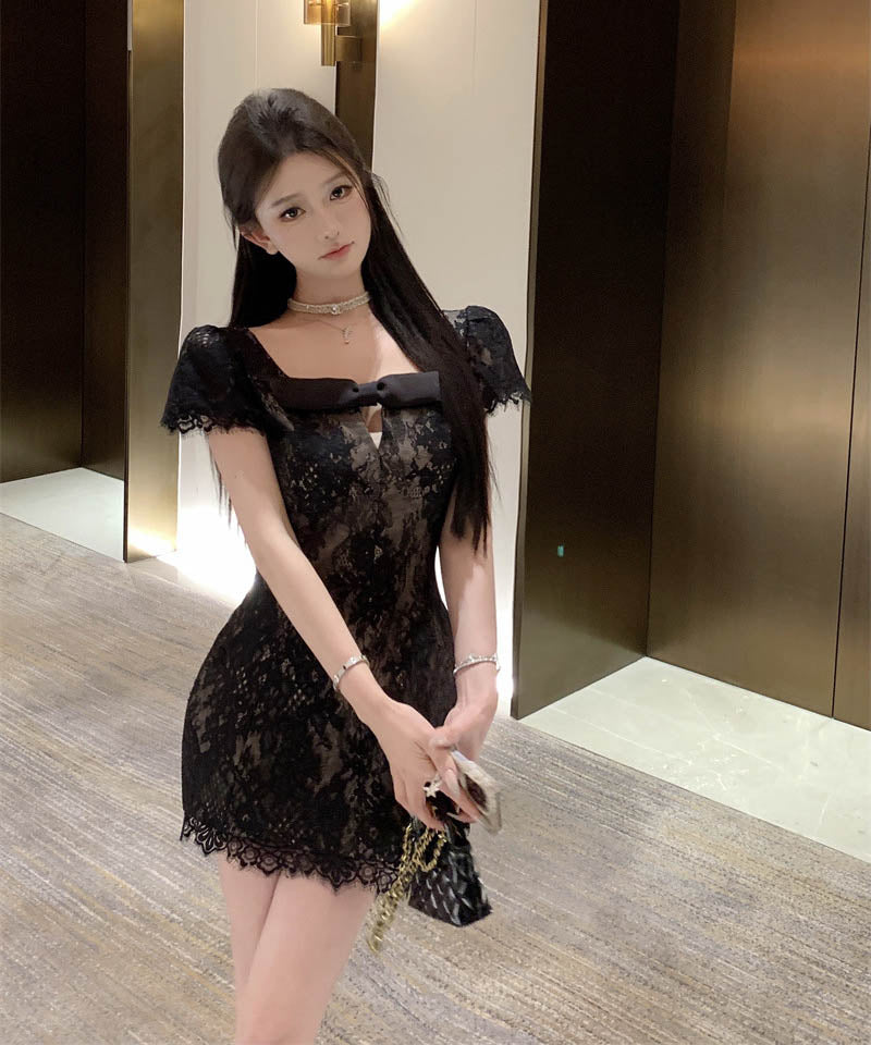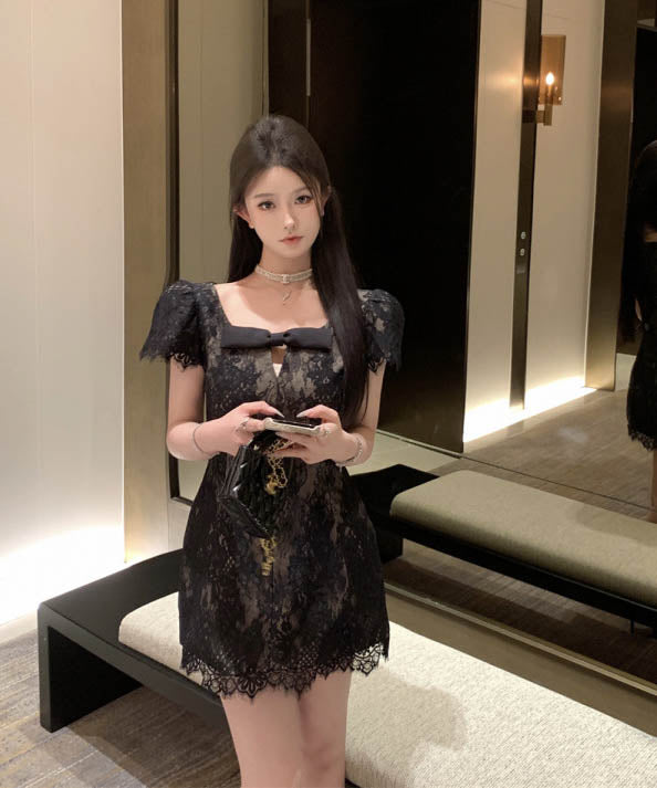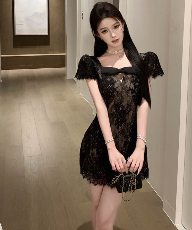 ミニドレスレースリボンパフスリーブエレガント体型カバー宴会パーティー女子力通勤 WQ2-ZED883254DXH502