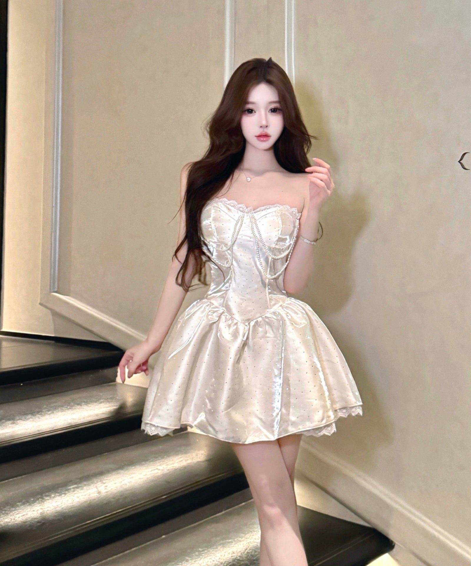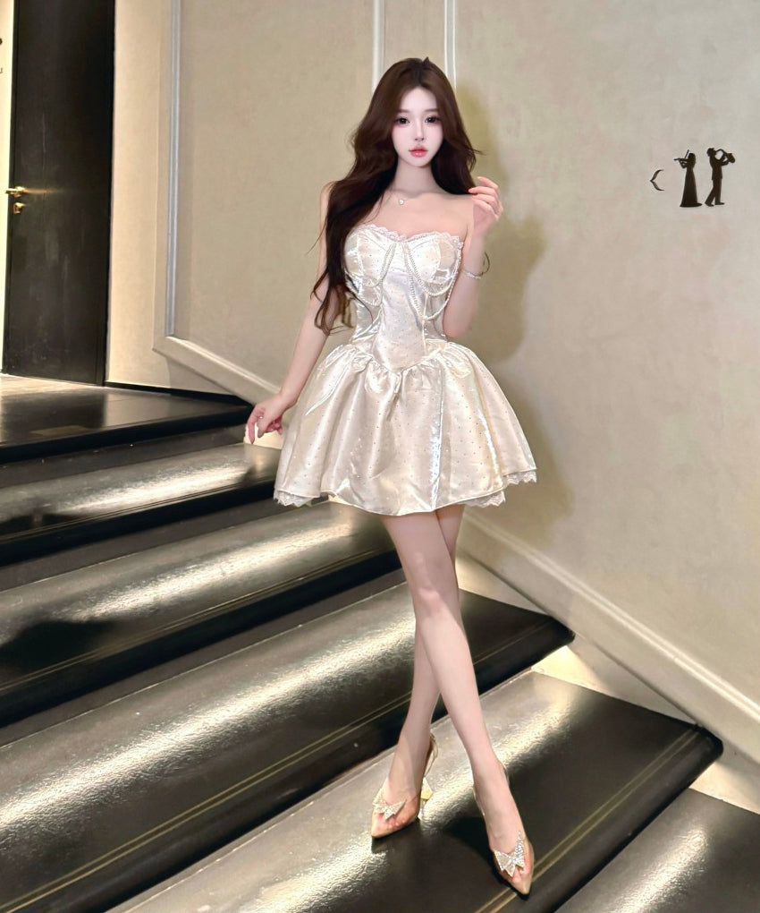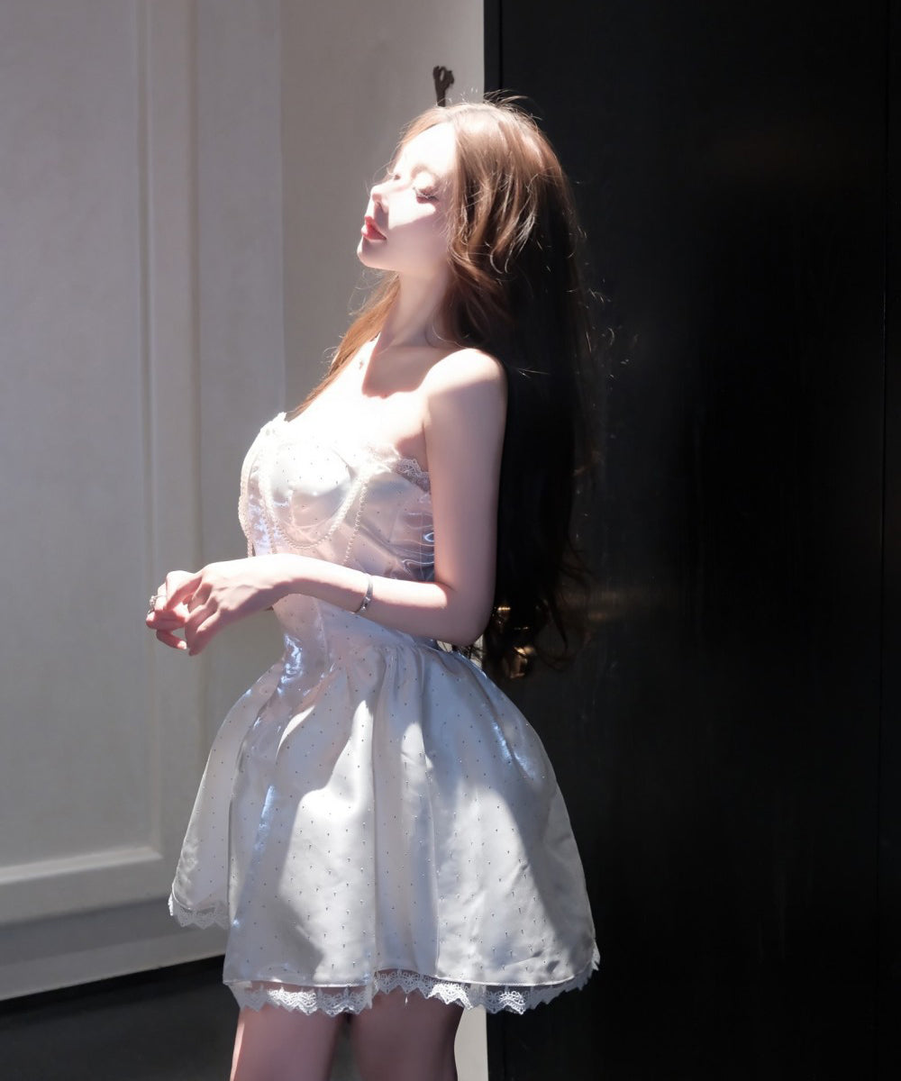 ミニドレス キャバドレス セクシー エレガント ビスチェ風 フレンチ風 パフスカート ウエストマーク 高見え レース×パール装飾 パーティー JC2-DD5746