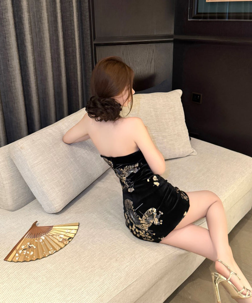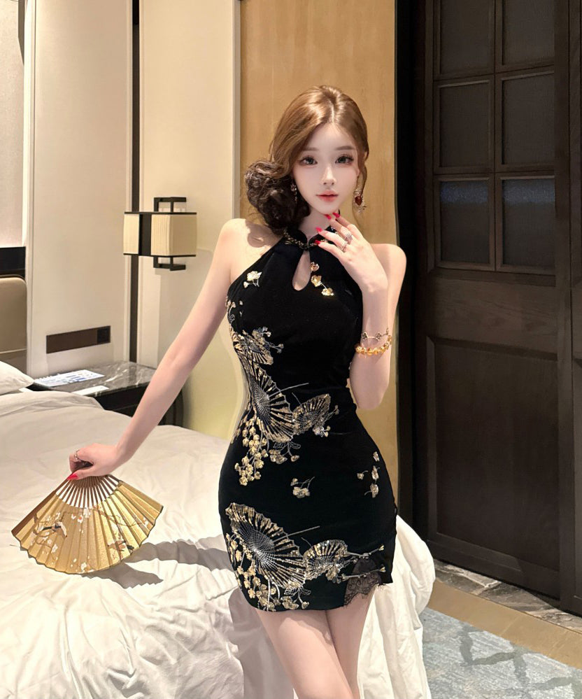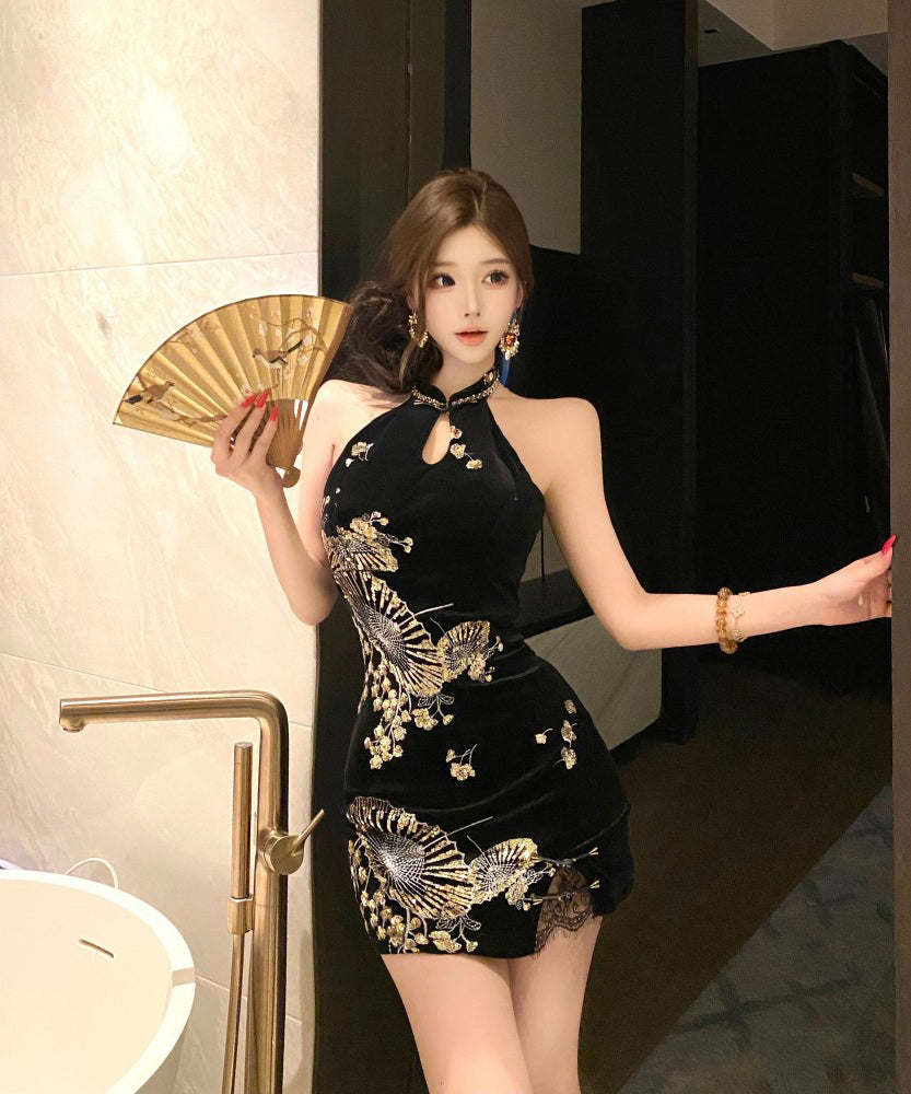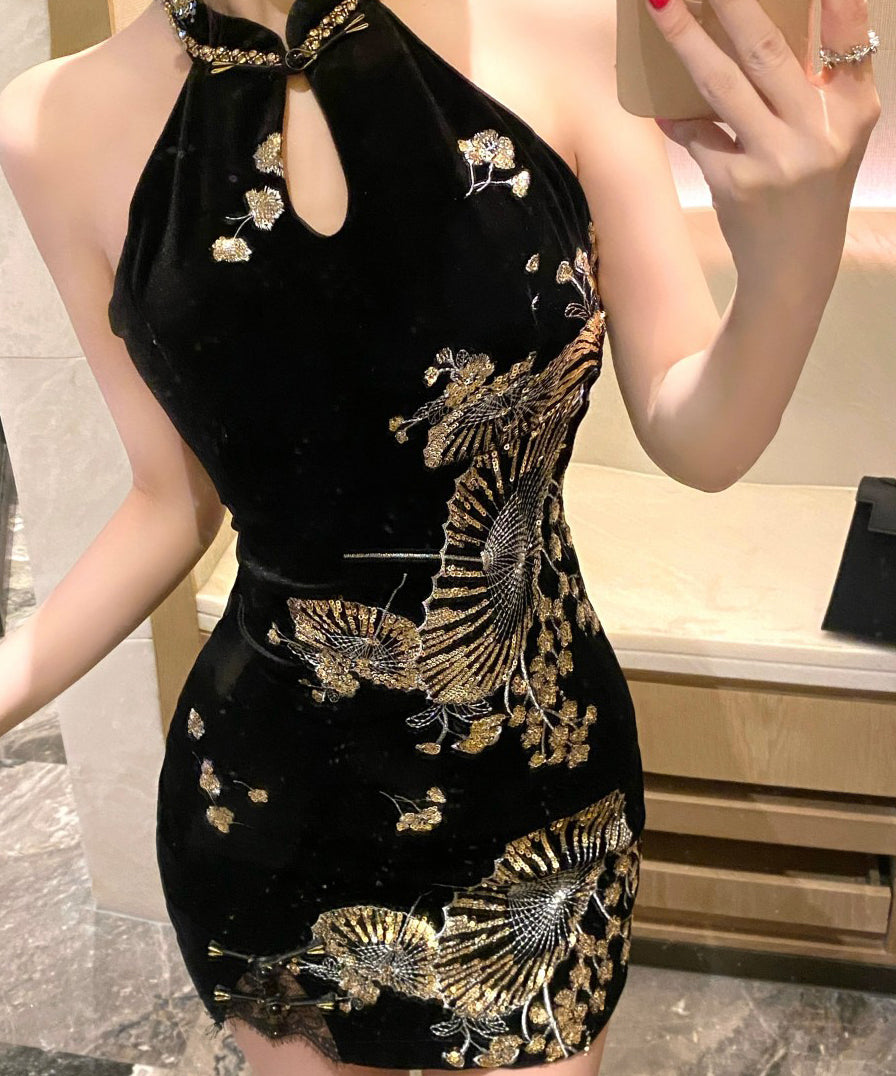 ミニドレス キャバドレス セクシー ギャル系 ボディコン中華風 ホルターネック スパンコール ベルベット ノースリーブ JC2-DD5743