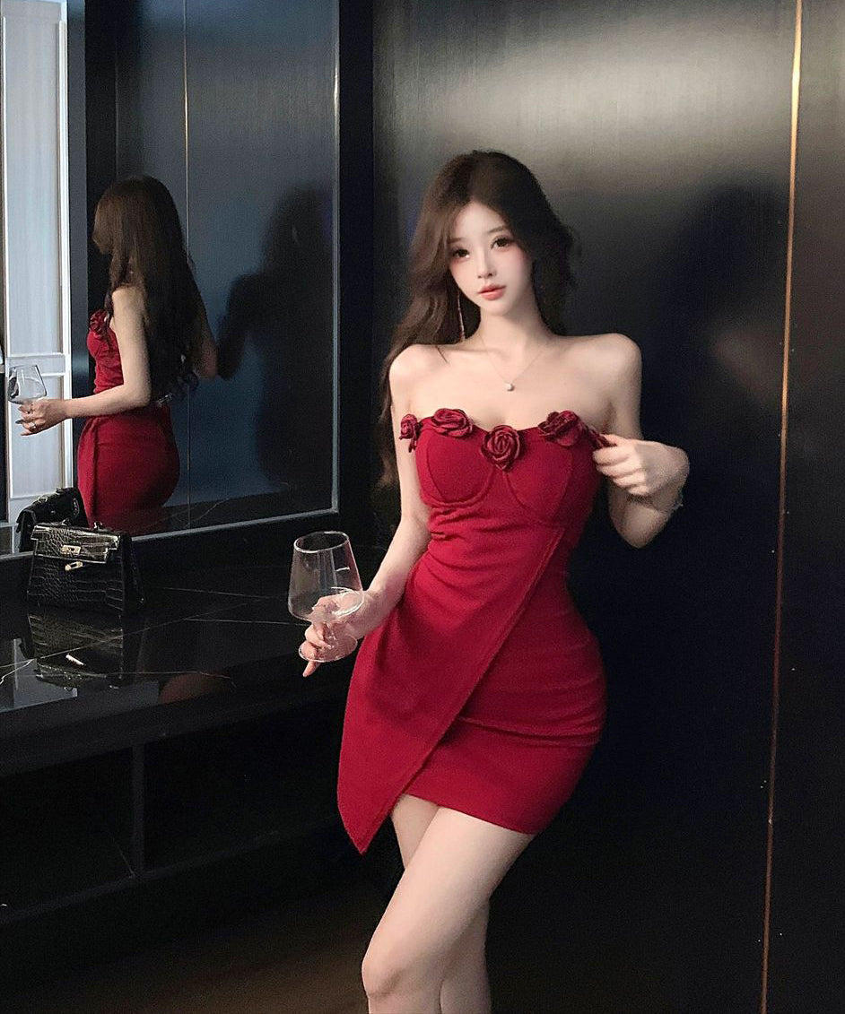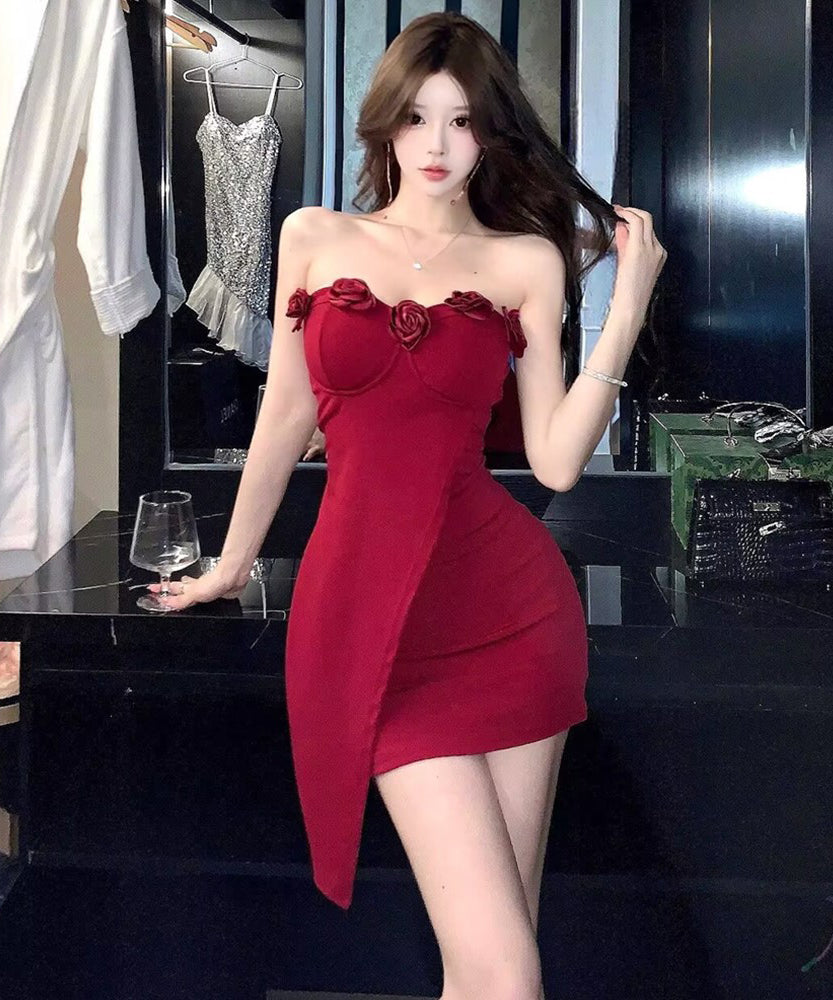 ミニドレス キャバドレス ベアトップ セクシー 非対称 パーティー フラワー 谷間見せ 指名 XH2-DD5056