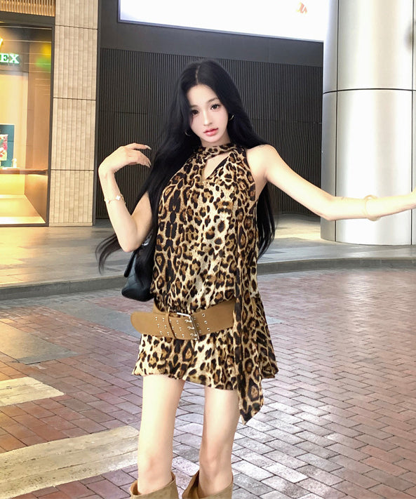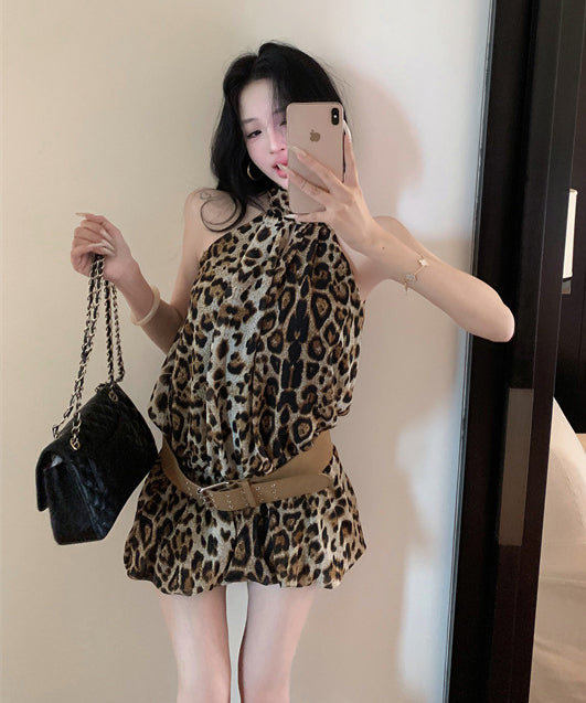 ミニドレス ホルターネック セクシー ヒョウ柄 ナイトクラブ キャバドレス SNS話題 XH2-XKD-D445-2369-Jun23