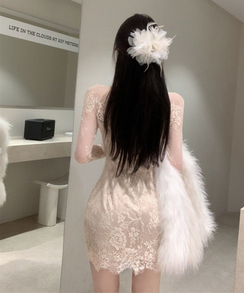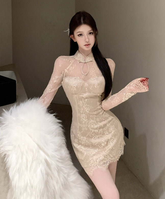 ミニドレス 中華風ワンピース レース タイトフィット 長袖ドレス セクシー エレガント 宴会 KS2-XKD-D308-6916-Dec15