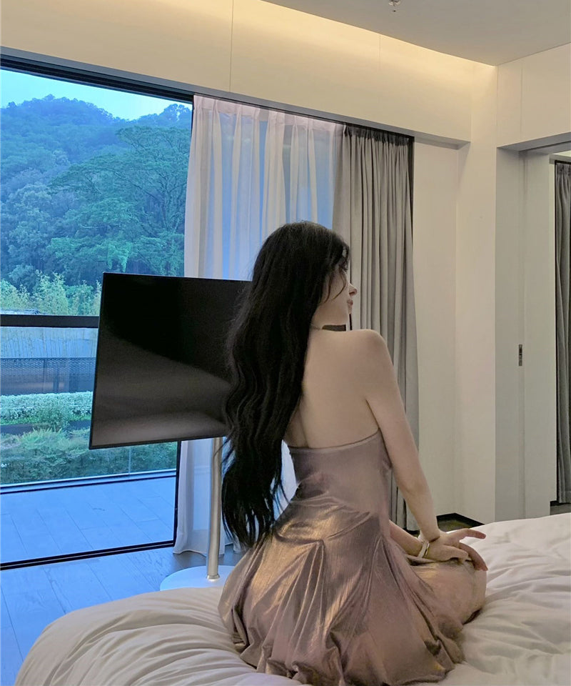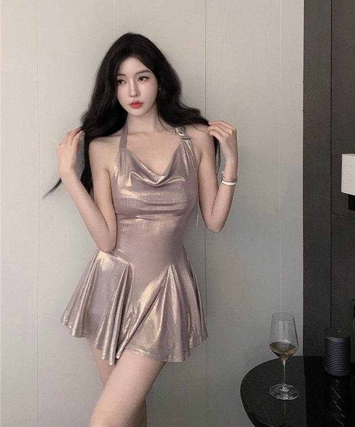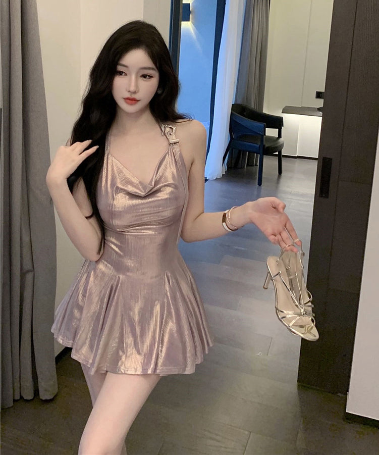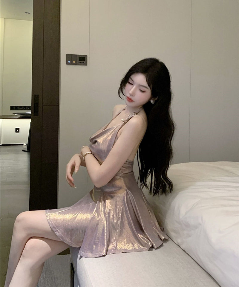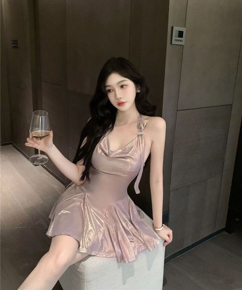 ミニドレス 光沢感 キャバドレス セクシー 着痩せ ホルターネック おしゃれ YH2-DD6890