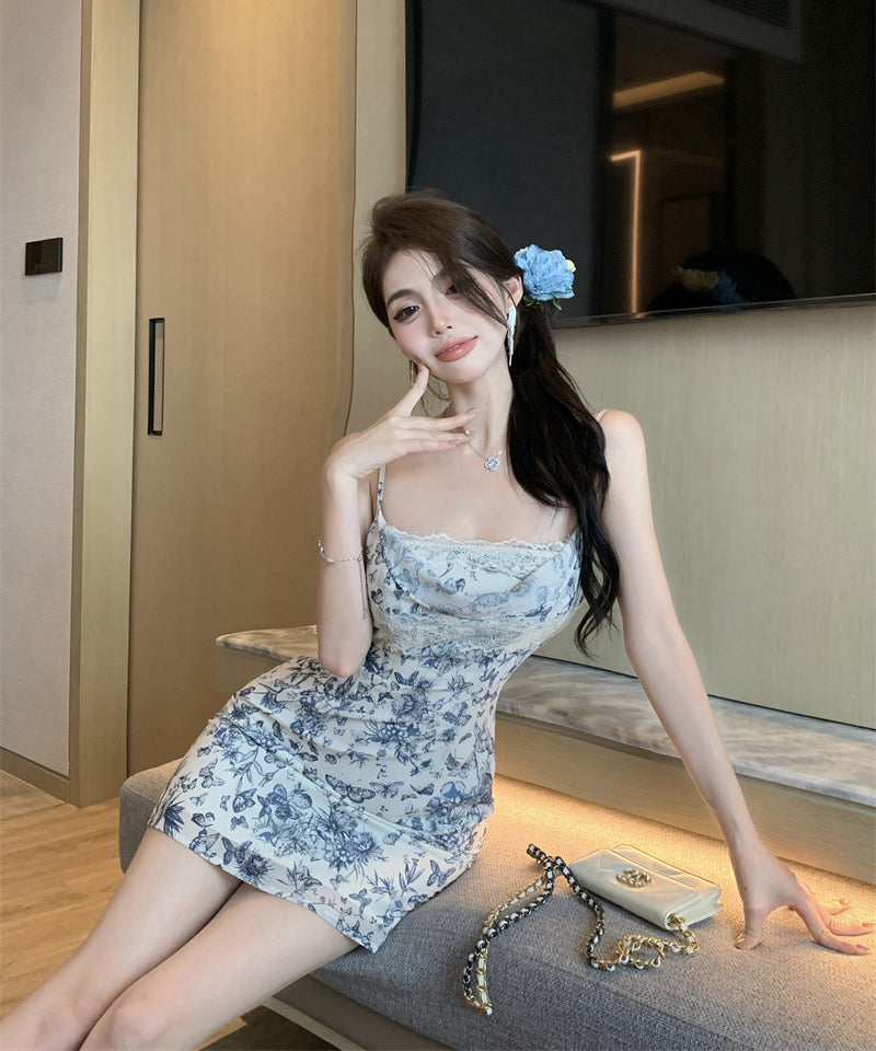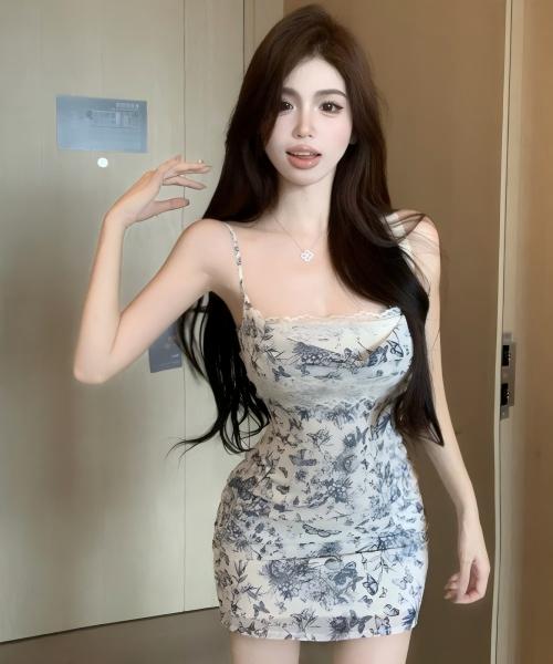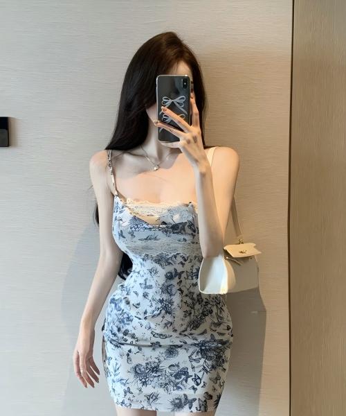 ミニドレス 新中華風レースキャミワンピース 秋花柄 ウエスト引き締め 細見えスリムデザインHMZ2-XKDD200-2389A-Jun10