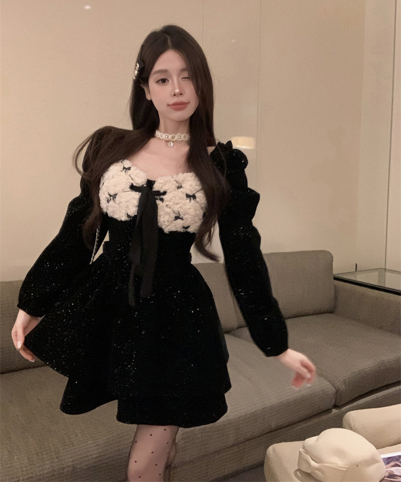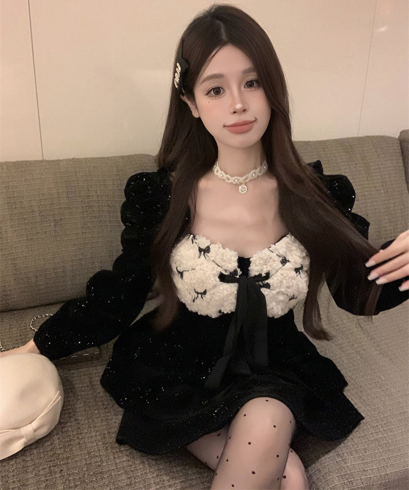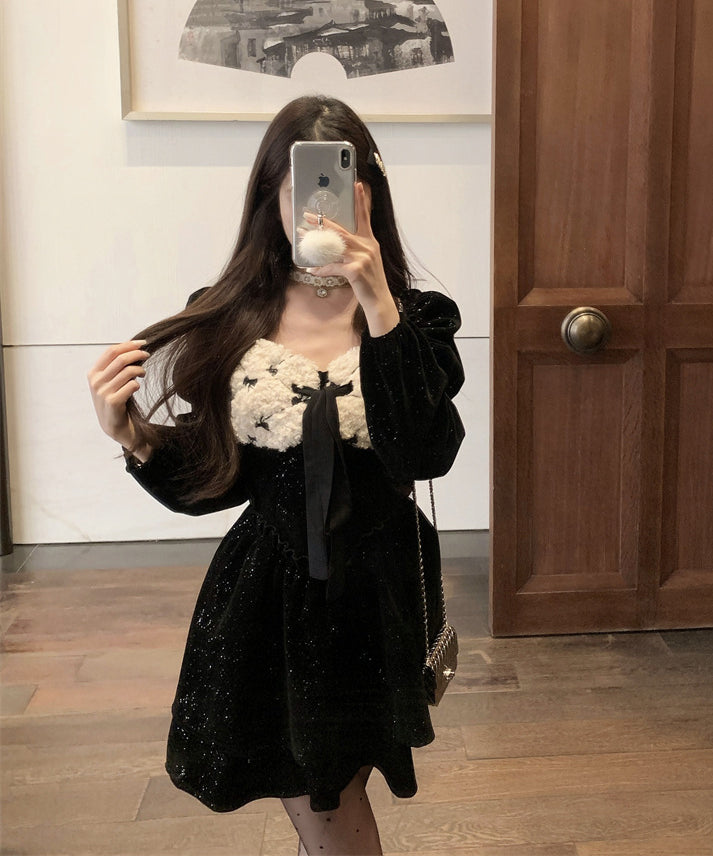 ミニドレス 新作 お姫様 袖付き Aライン 大人可愛い 韓国っぽ 着痩せ XH2-XKD-D355-9575-Oct12