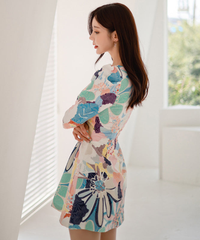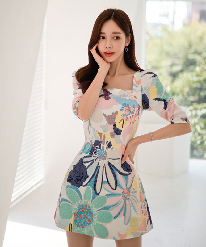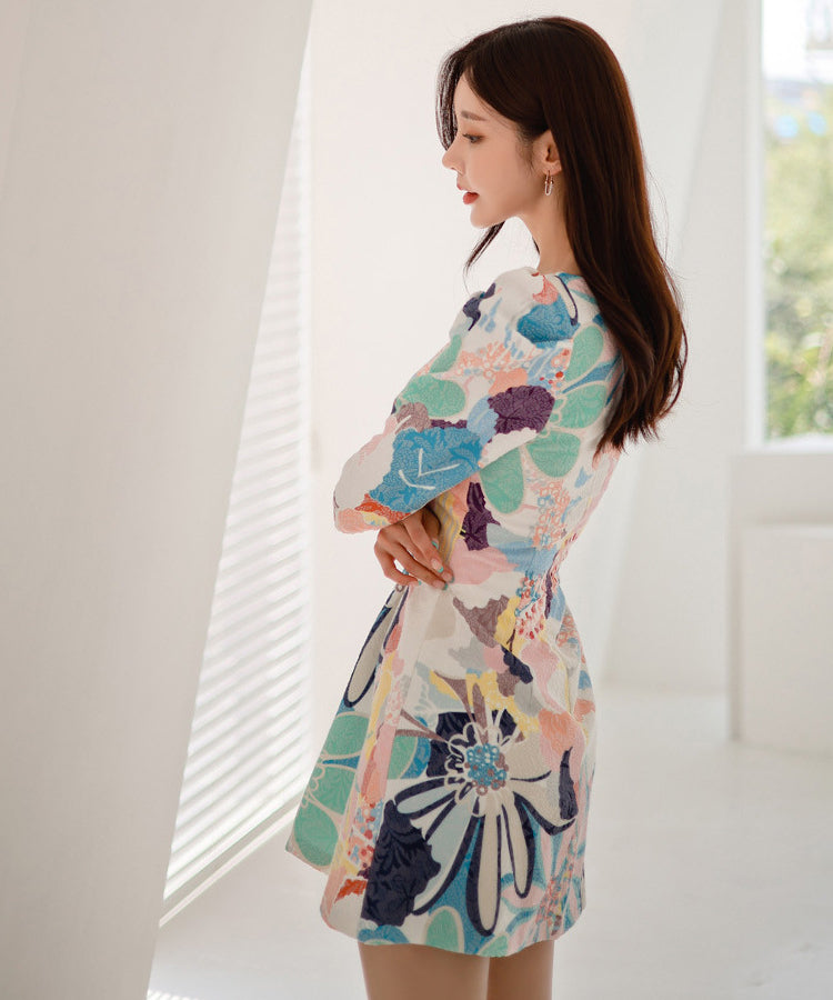 ミニドレス 花柄 春新作 パフスリーブ Aライン エレガント 着痩せ おしゃれ XH2-ZED886608BH506