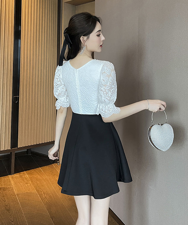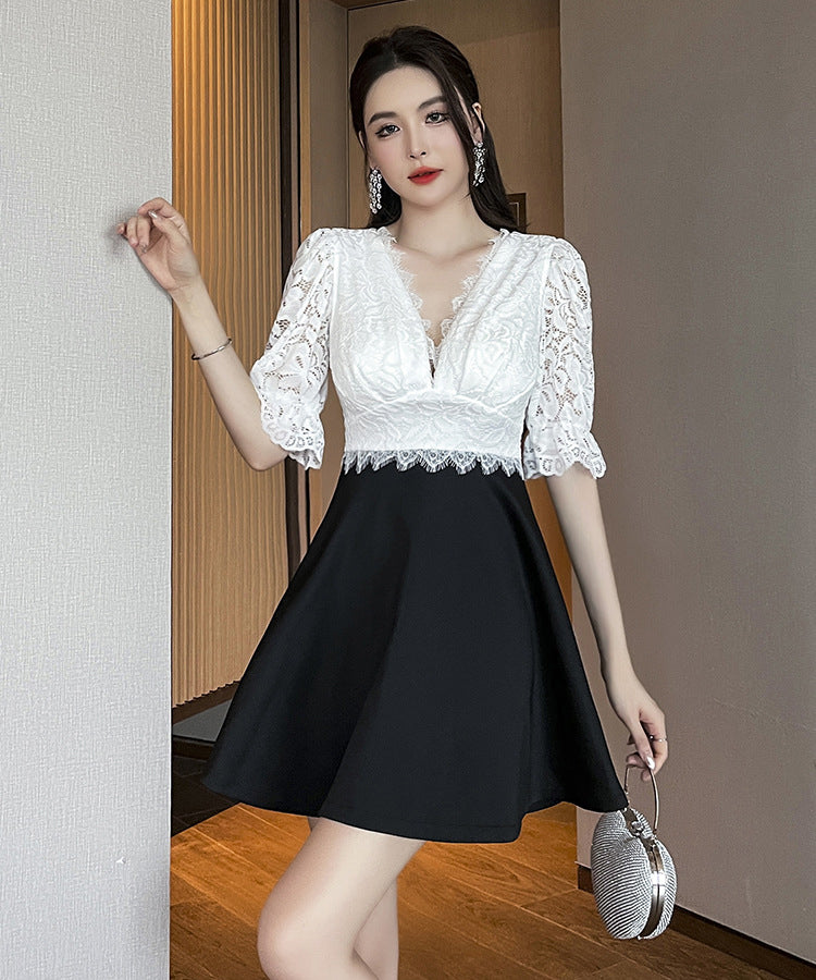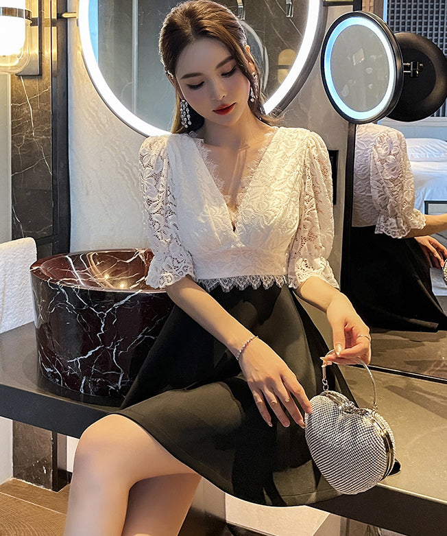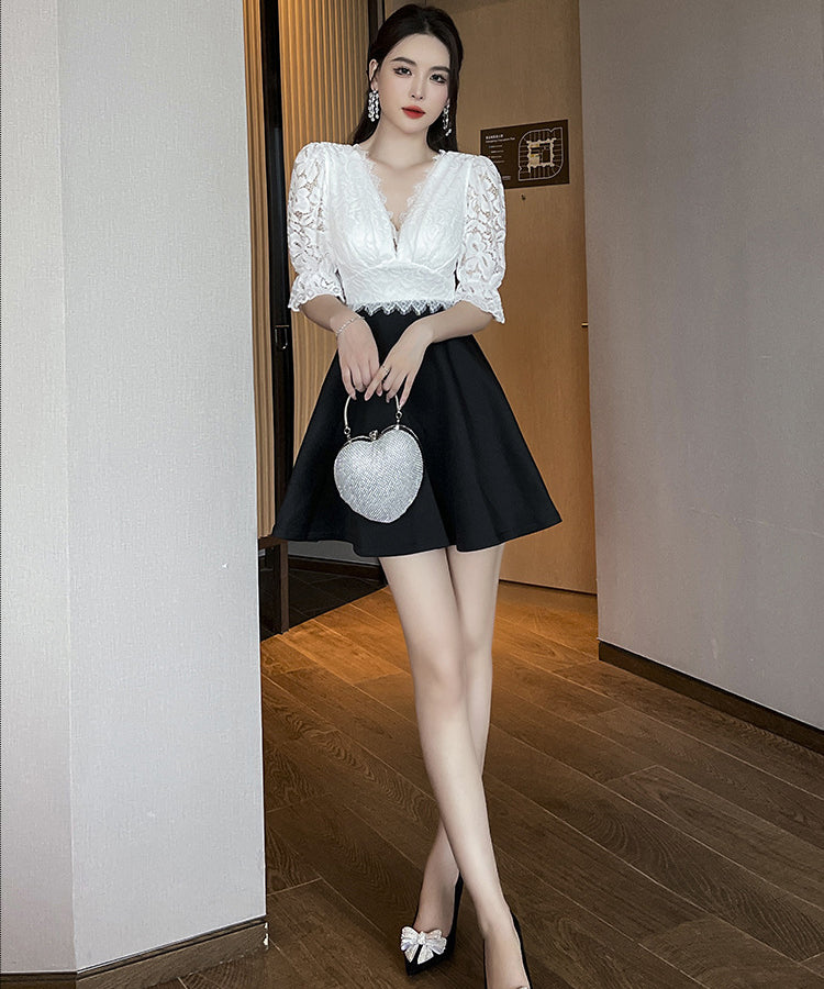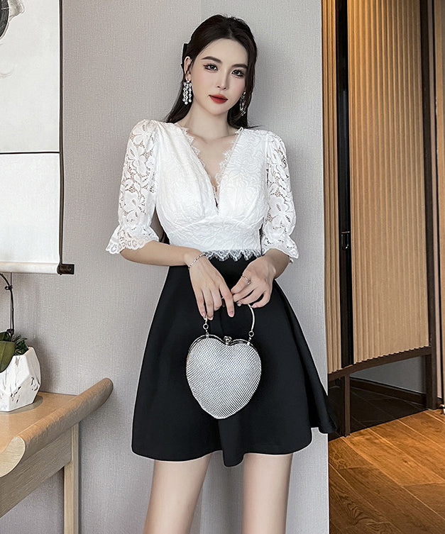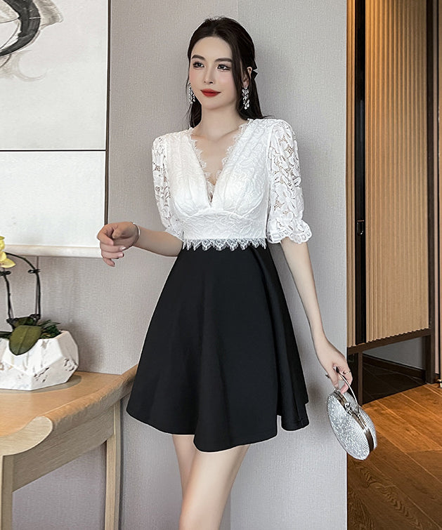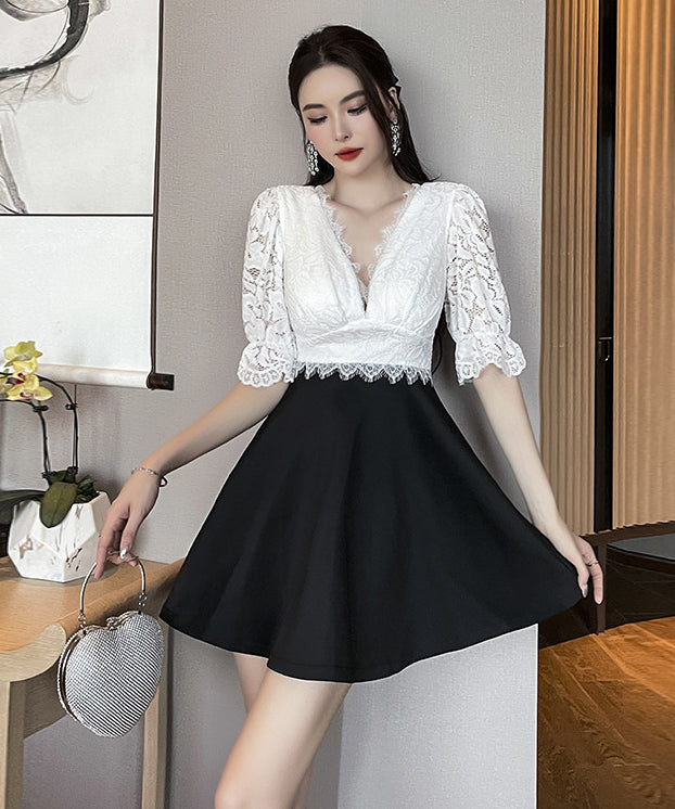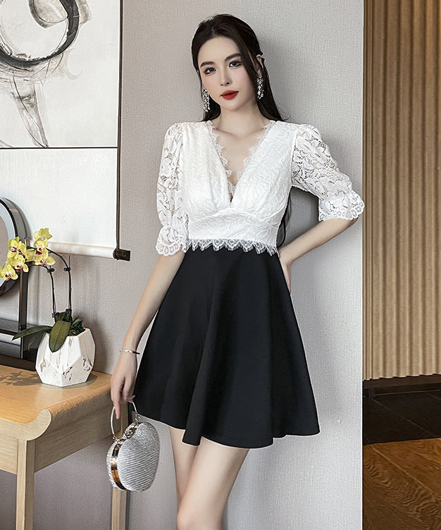 ミニドレス Vネック レース 谷間見せ Aライン 着痩せ カワセクシー ガーリー XH2-YM8801