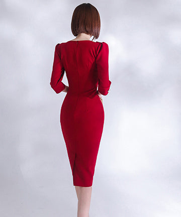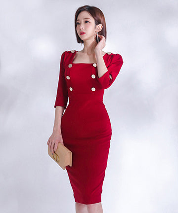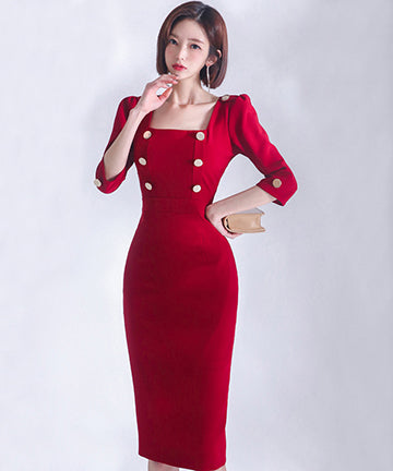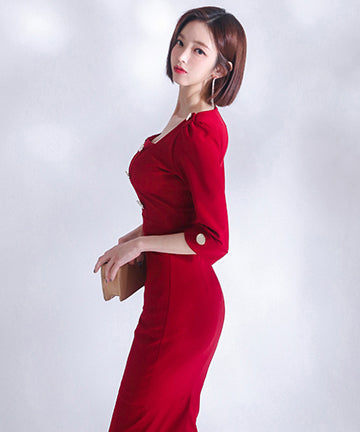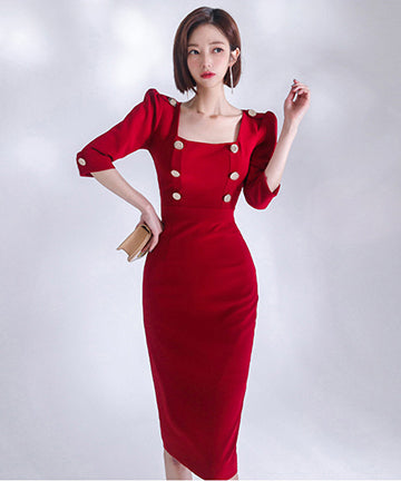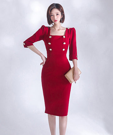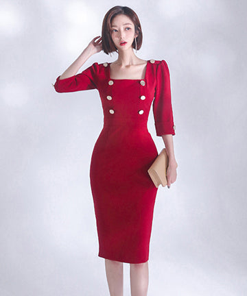 レッドドレス スクエアネック セクシー エレガント アームカバー タイトドレス XH2-ZED882535BH506