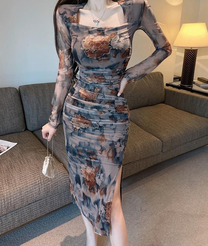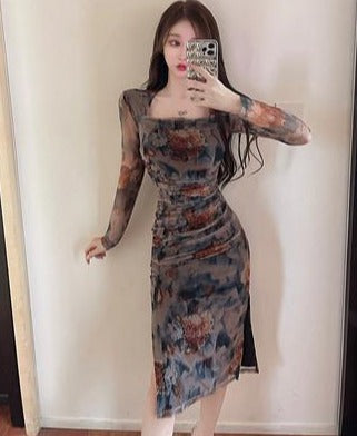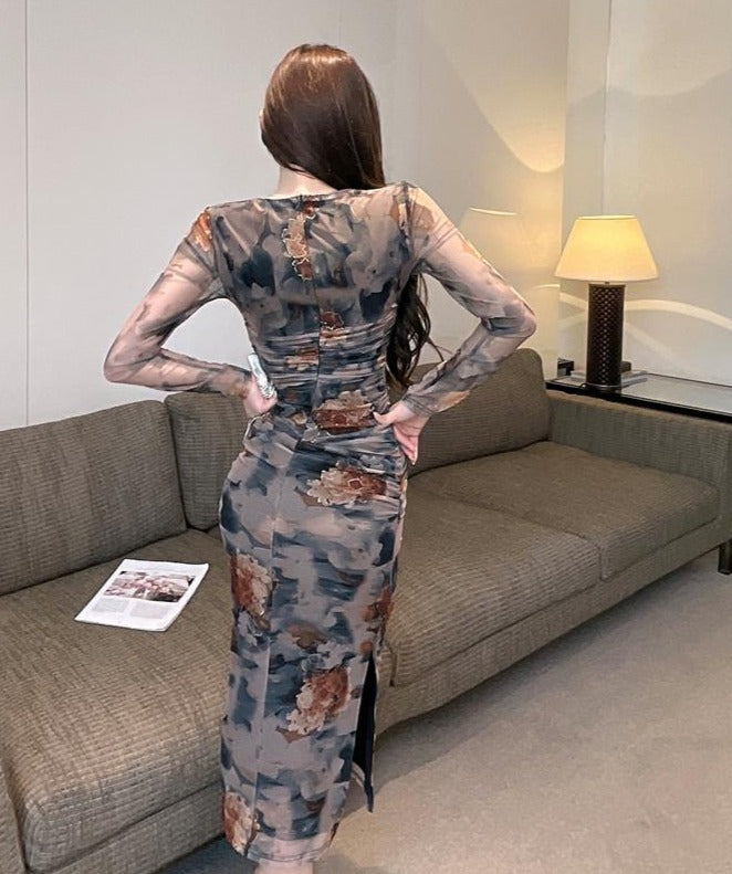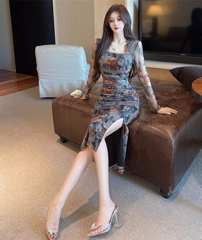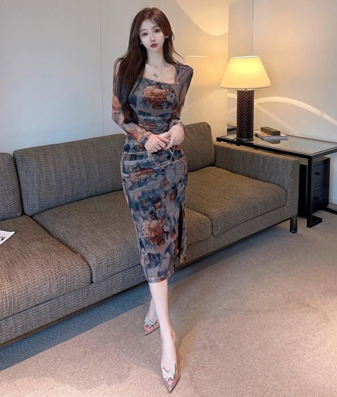 レトロフラワーズプリーツメッシュスリットベースドレスロングドレス XY2-9872