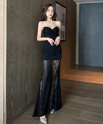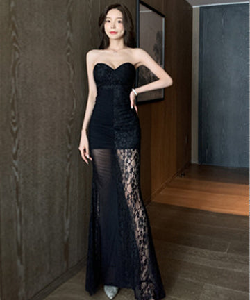 レース ロングドレス 宴会 パーティー ワンショルダー 脚長効果 ゴージャス LT2-YM9106