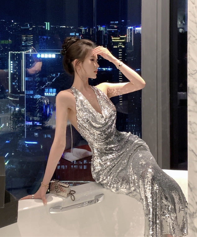 ロングドレスキャバドレスキラキラホルターネック谷間見せイベント高級感華奢感ナイトドレスセクシー誕生日パーティー宴会 WQ2-ZED883589HS109