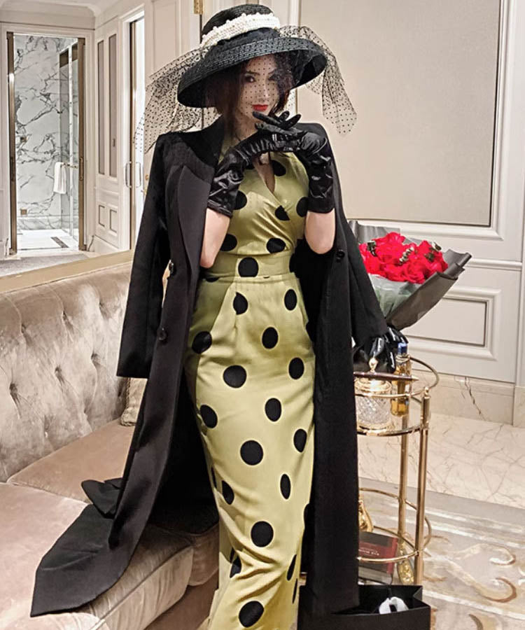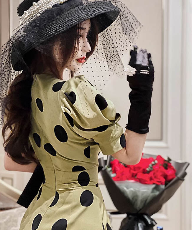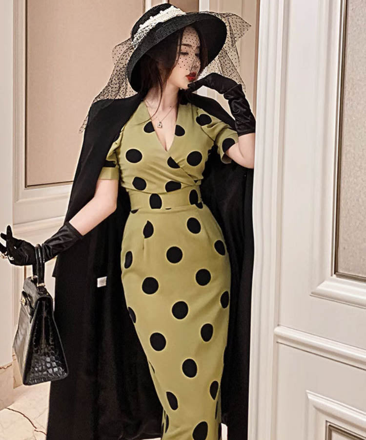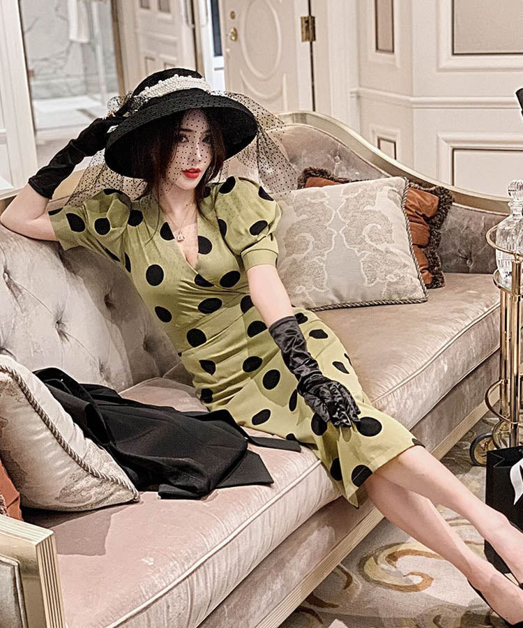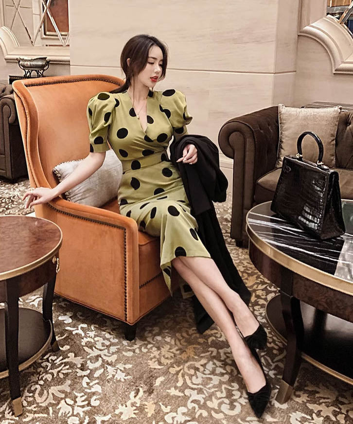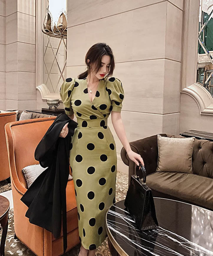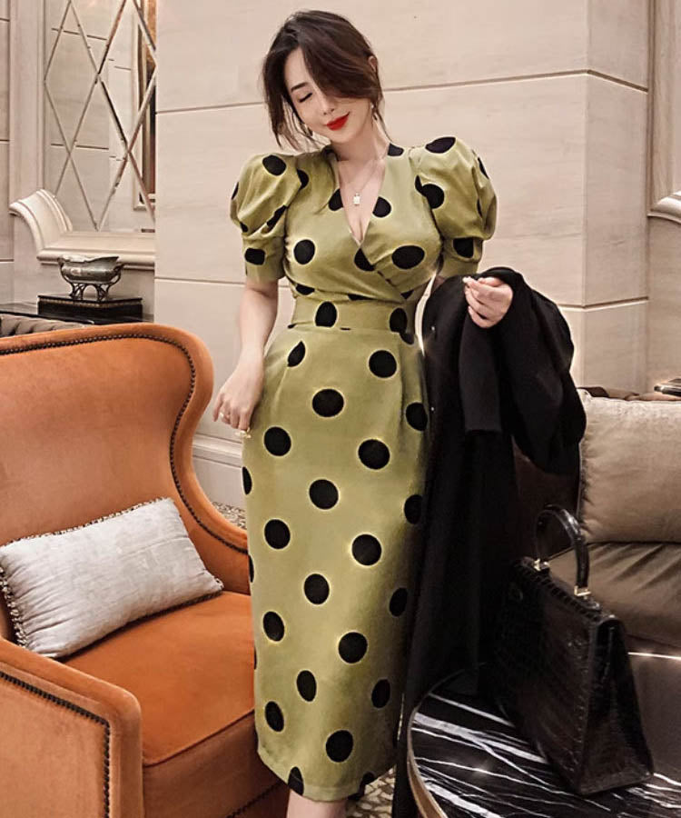 ロングドレスパフスリーブ水玉柄エレガントセクシー通勤韓国っぽハイウエスト着痩せVネック WQ2-ZED883562A71