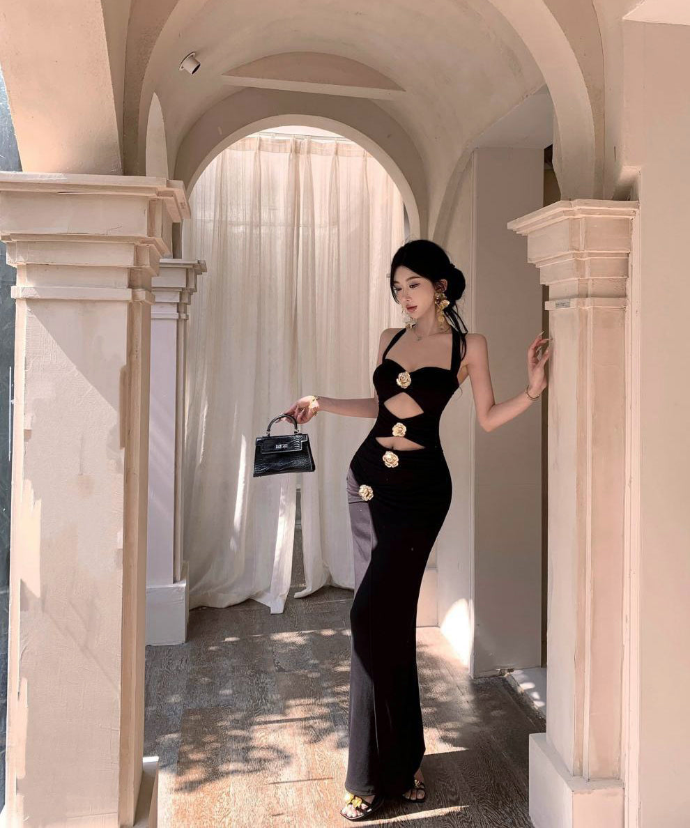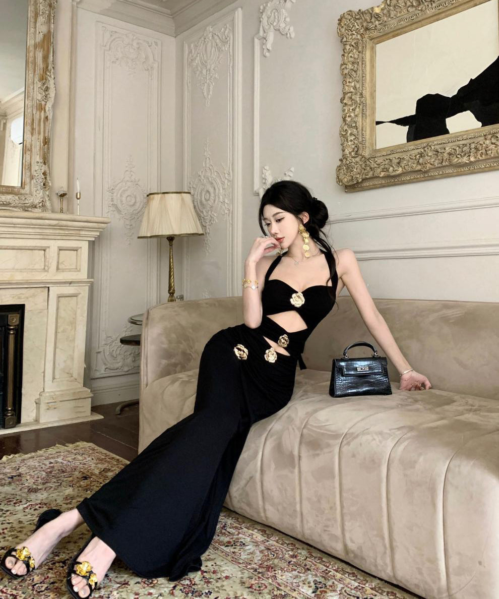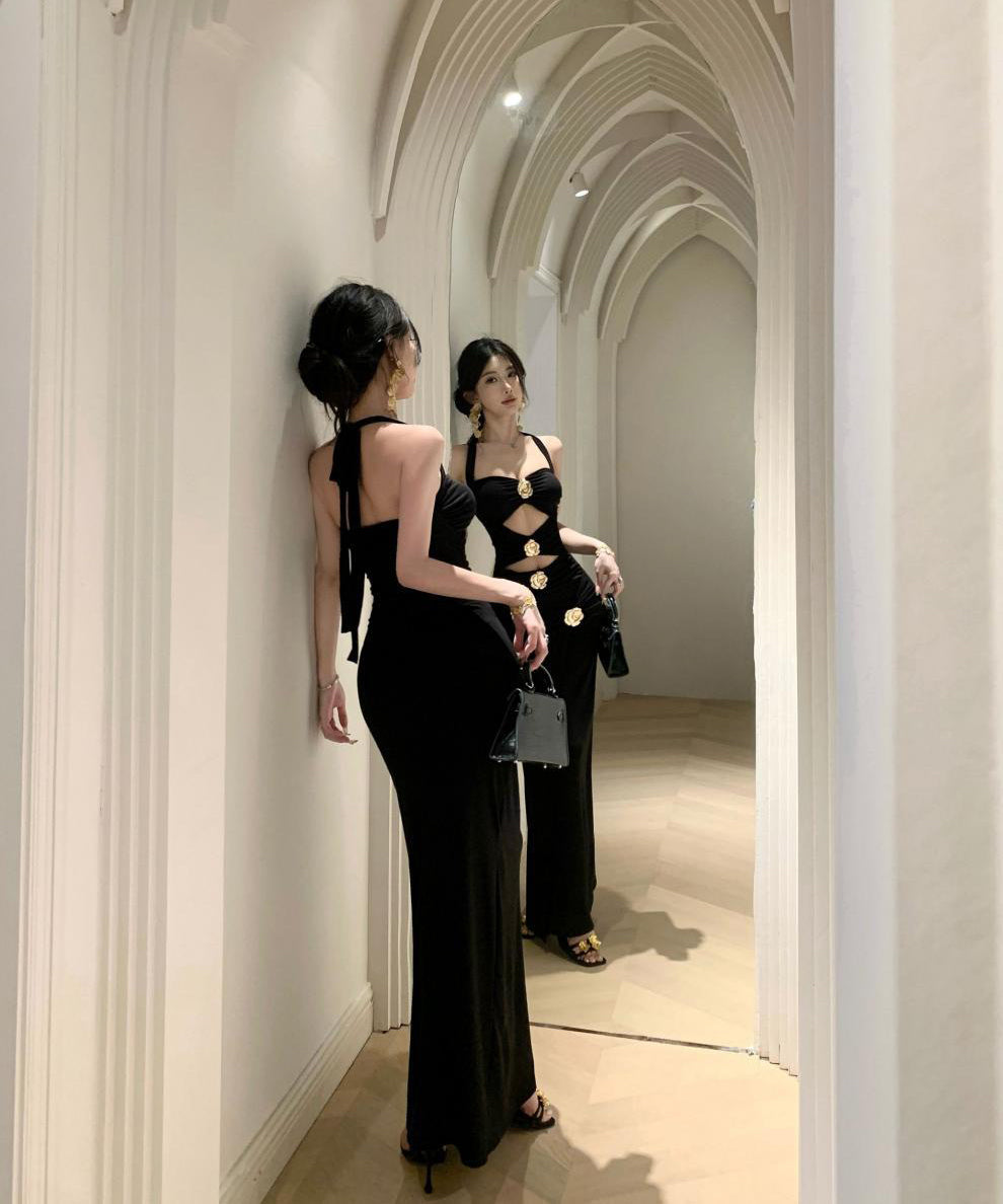 ロングドレスフラワー透かし彫りホルターネック宴会パーティーナイトクラブキャバドレス肌見せ WQ2-ZED888610DXH238A