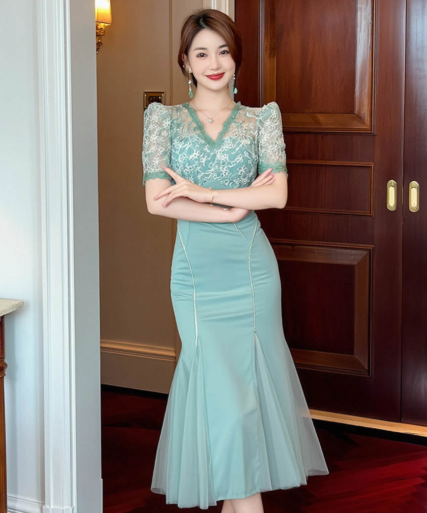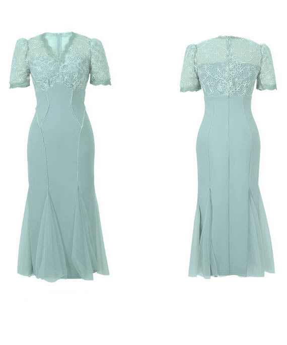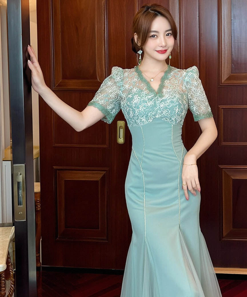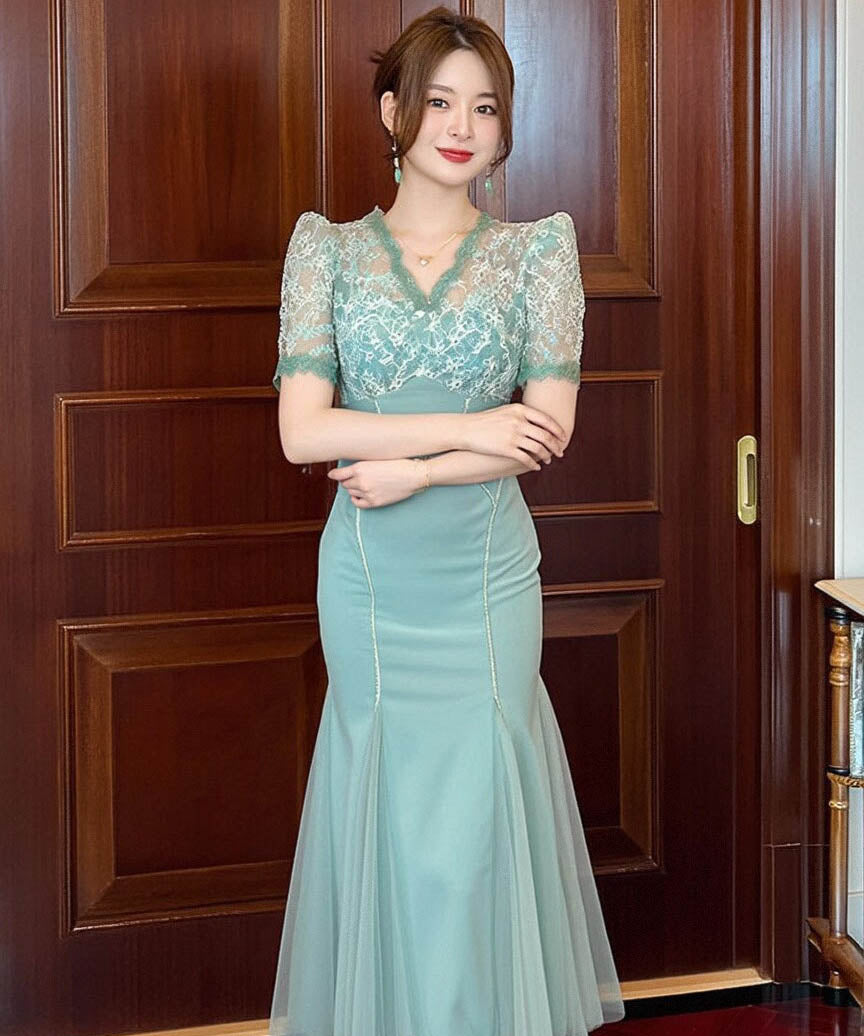 ロングドレス手作りドレス高級感レースチュールマーメイドドレスVネック小顔着痩せ気質宴会パーティー二次会高級感 WQ2-JY21099