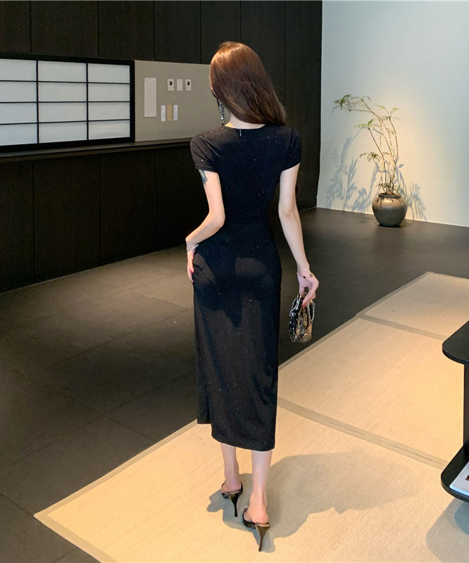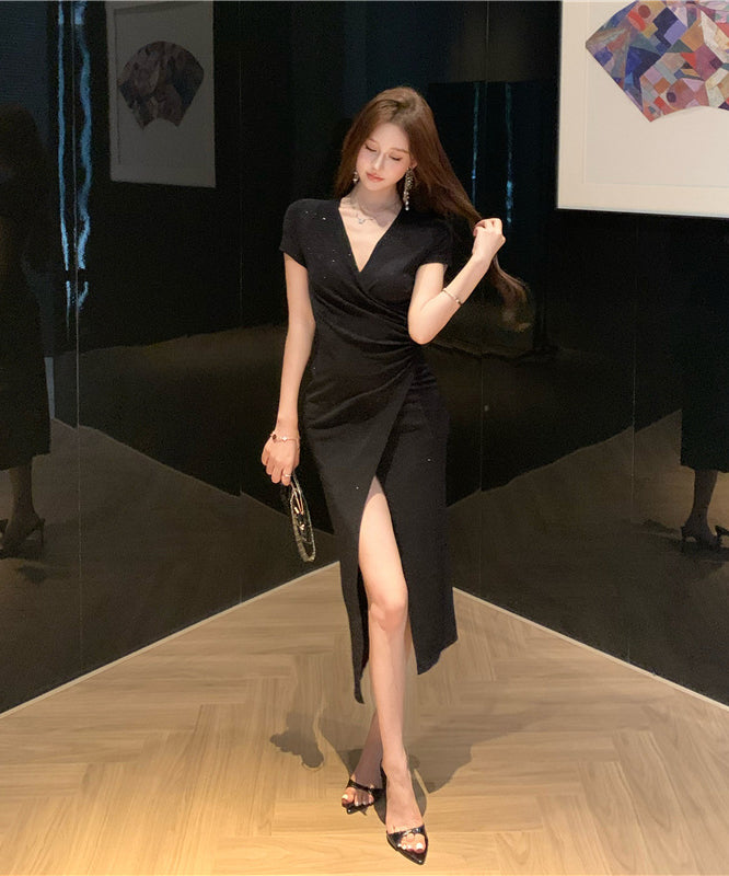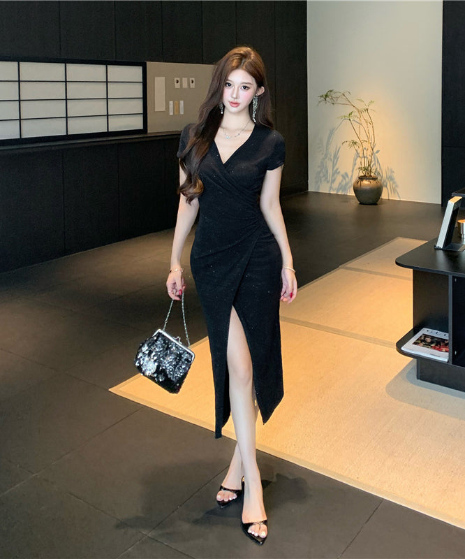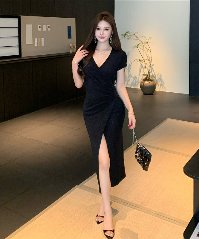 ロングドレス キャバドレス セクシー フェミニン キラキラ セレブ風 Vネック クロスヘム ボディコン ハイスリット パーティー JC2-LQE1205HF350