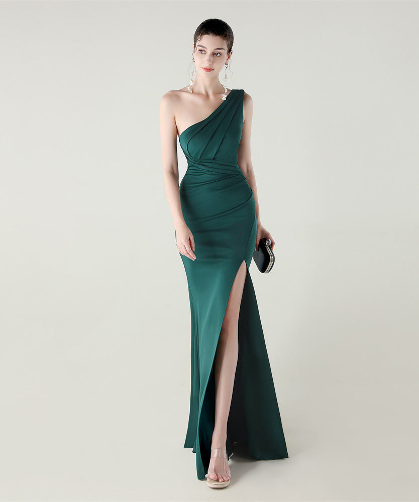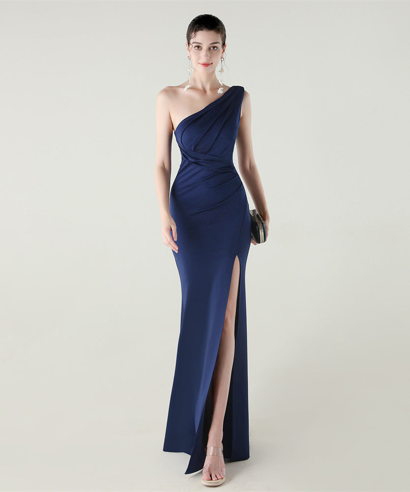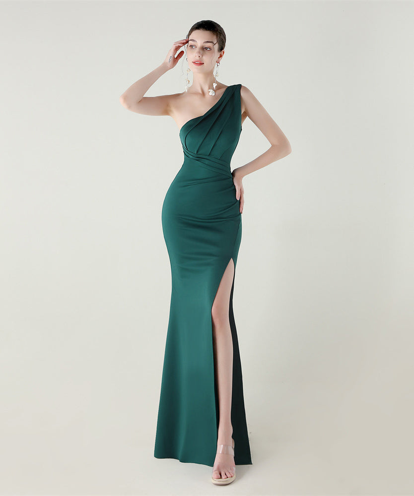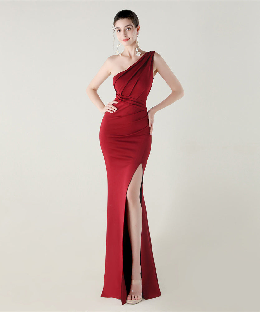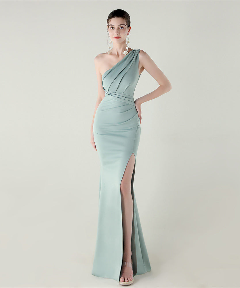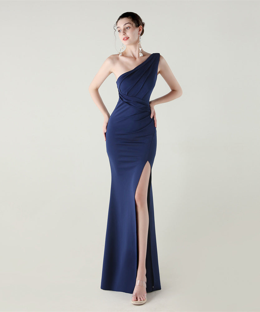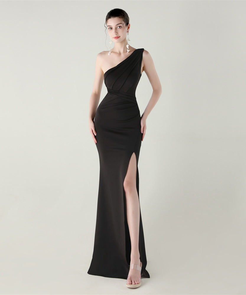 ロングドレス キャバドレス セクシー ワンショルダー サテン タイト マーメイドドレス プリーツ スリット入り 夜会 パーティー 結婚式 JC2-YEY33598