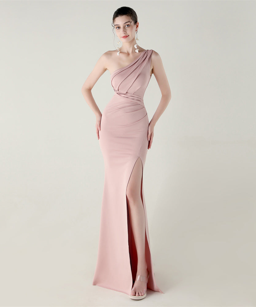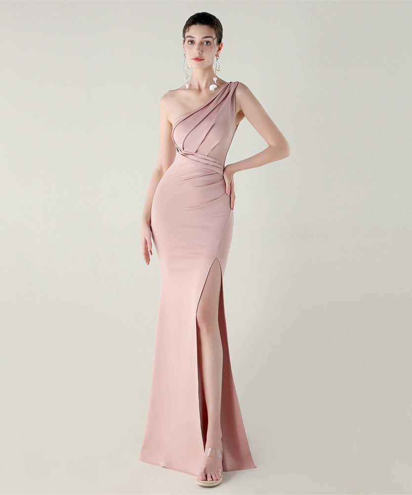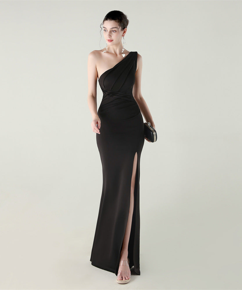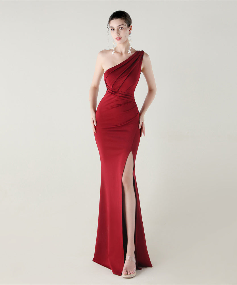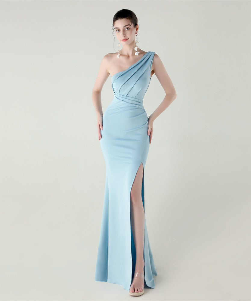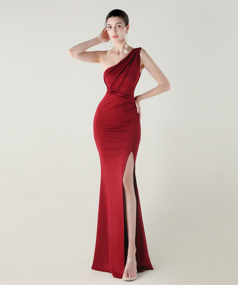 ロングドレス キャバドレス セクシー ワンショルダー サテン タイト マーメイドドレス プリーツ スリット入り 夜会 パーティー 結婚式 JC2-YEY33598