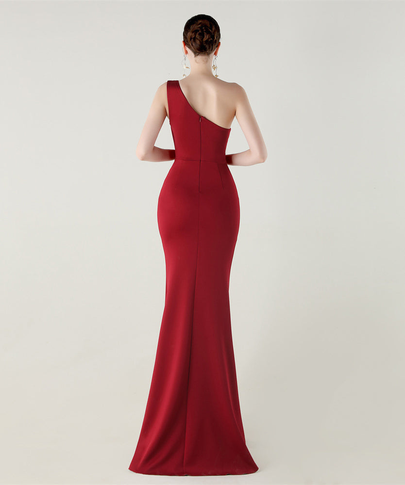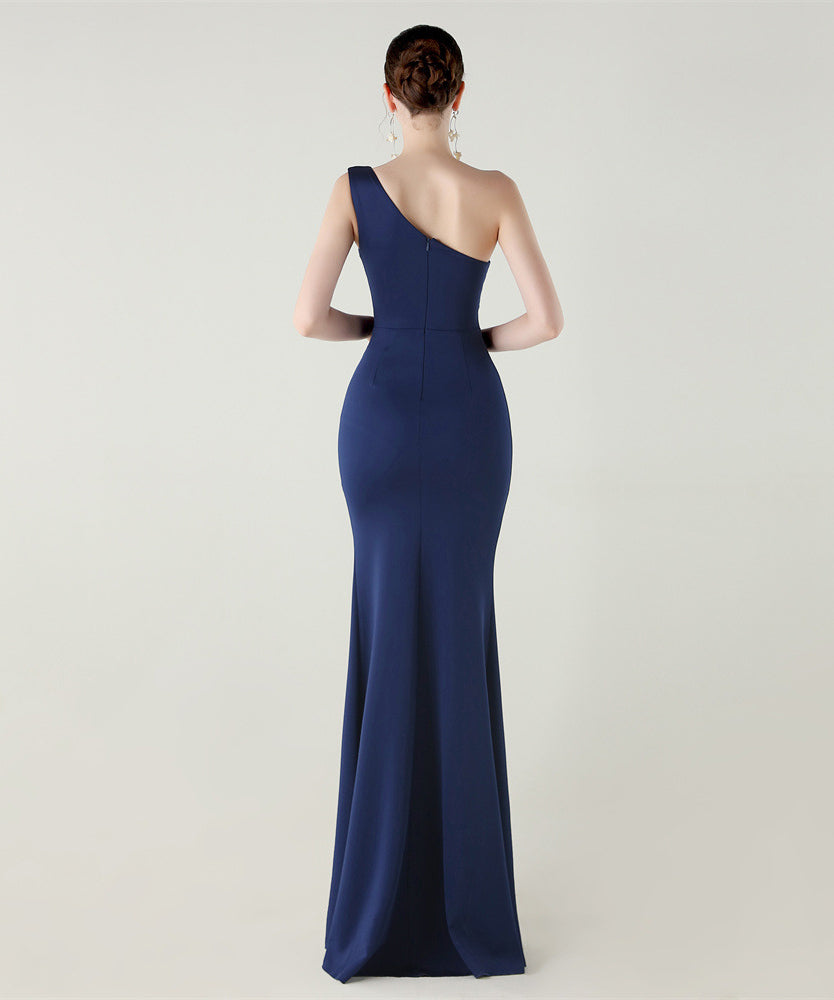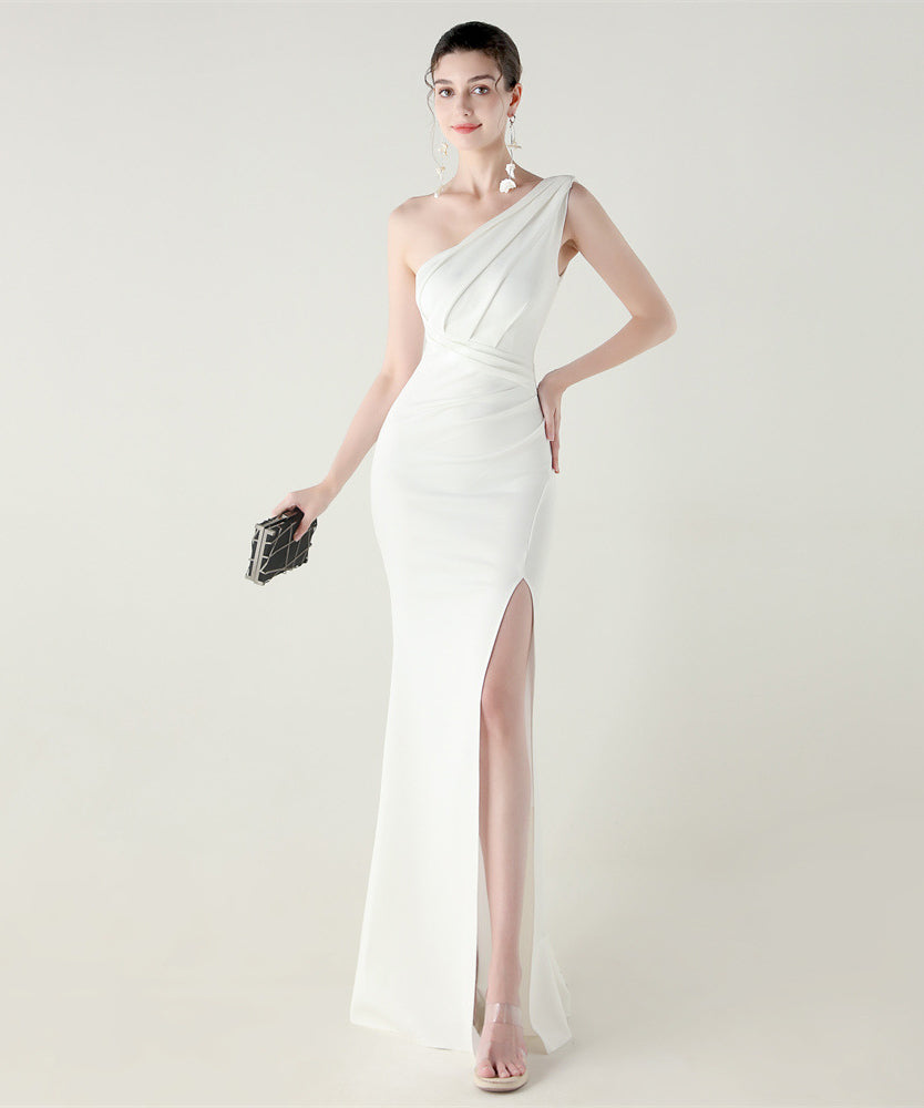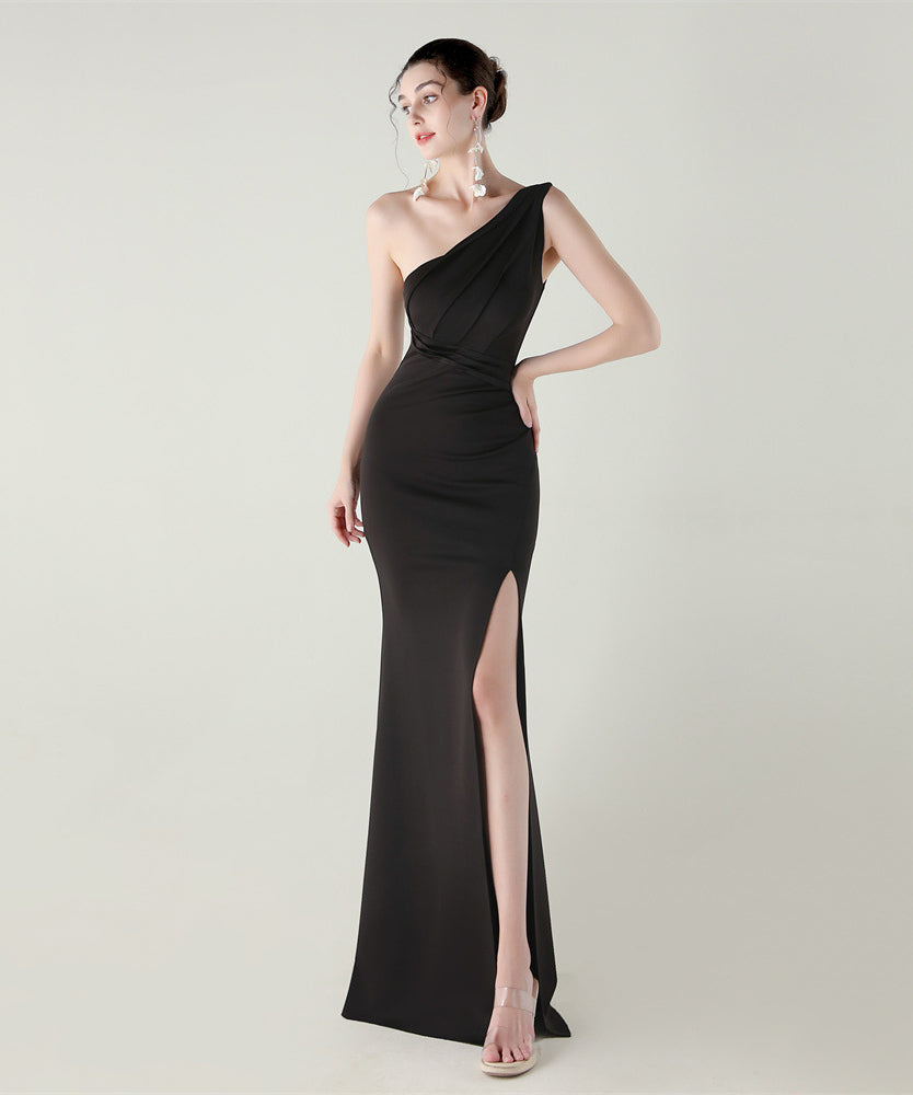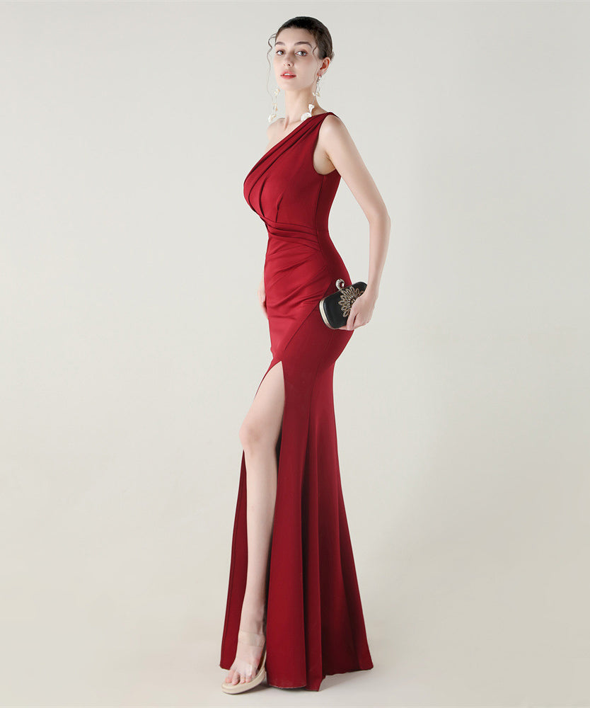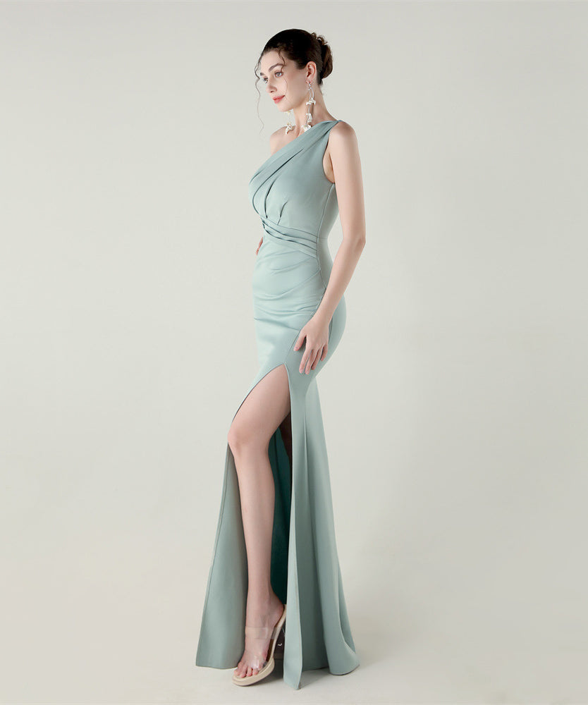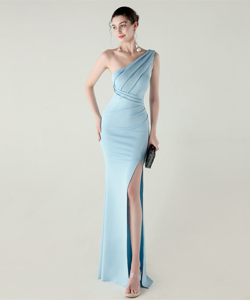 ロングドレス キャバドレス セクシー ワンショルダー サテン タイト マーメイドドレス プリーツ スリット入り 夜会 パーティー 結婚式 JC2-YEY33598