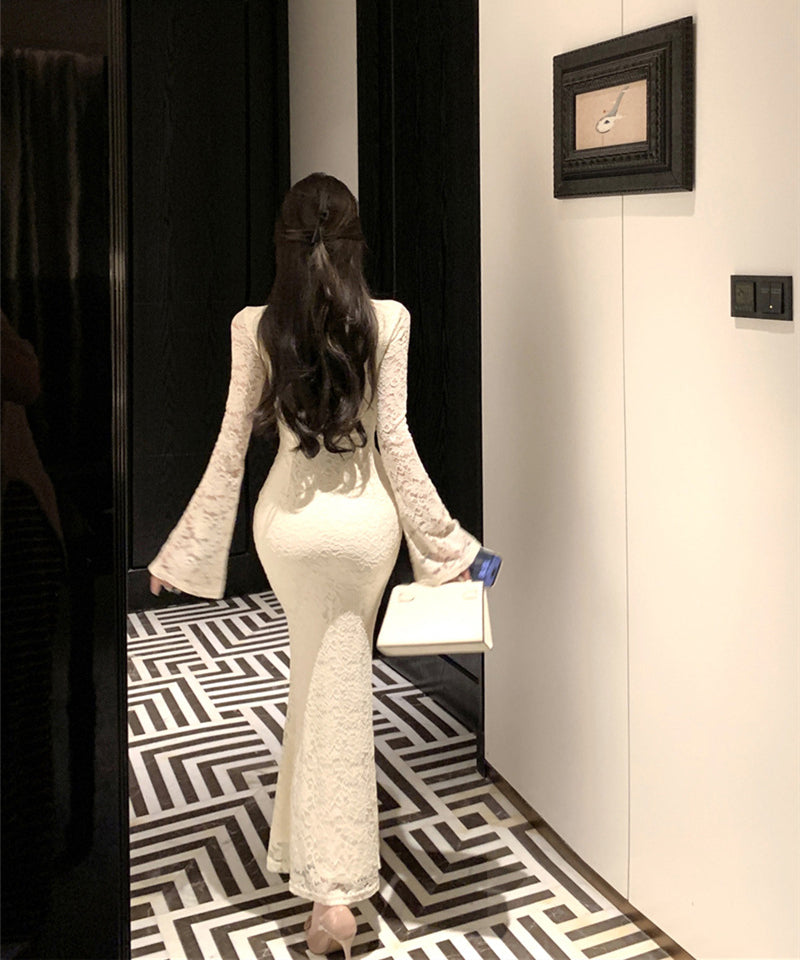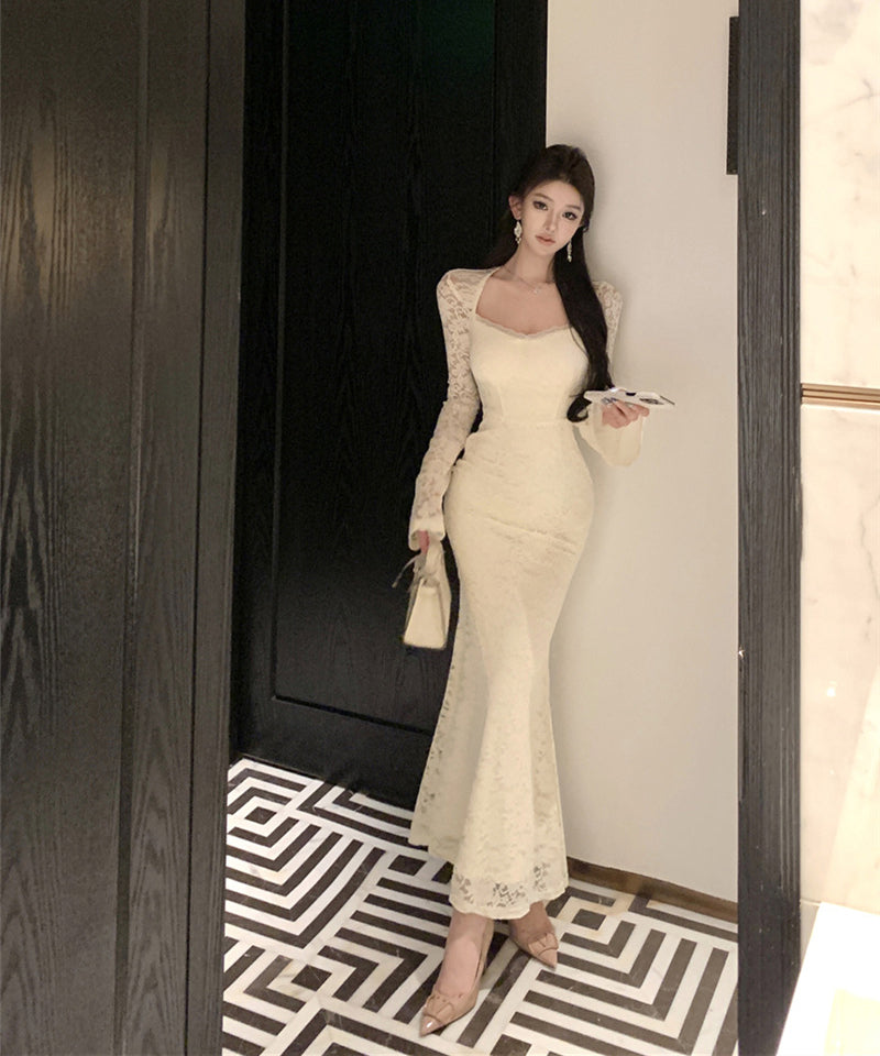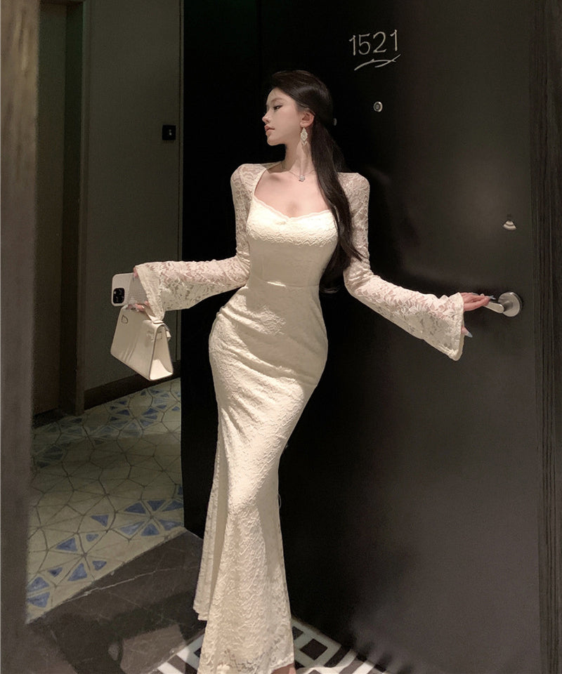 ロングドレス キャバドレス 大人フェミニン スクエアネック ロングスリーブ レースあしらい シェイプドウエスト 上品 二次会 パーティー JC2-XKDD337B-2117-Sep1