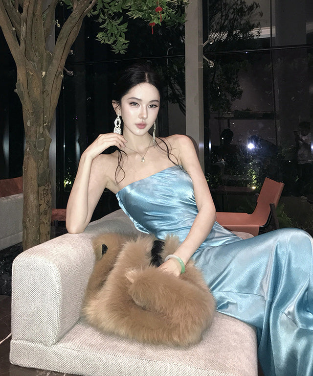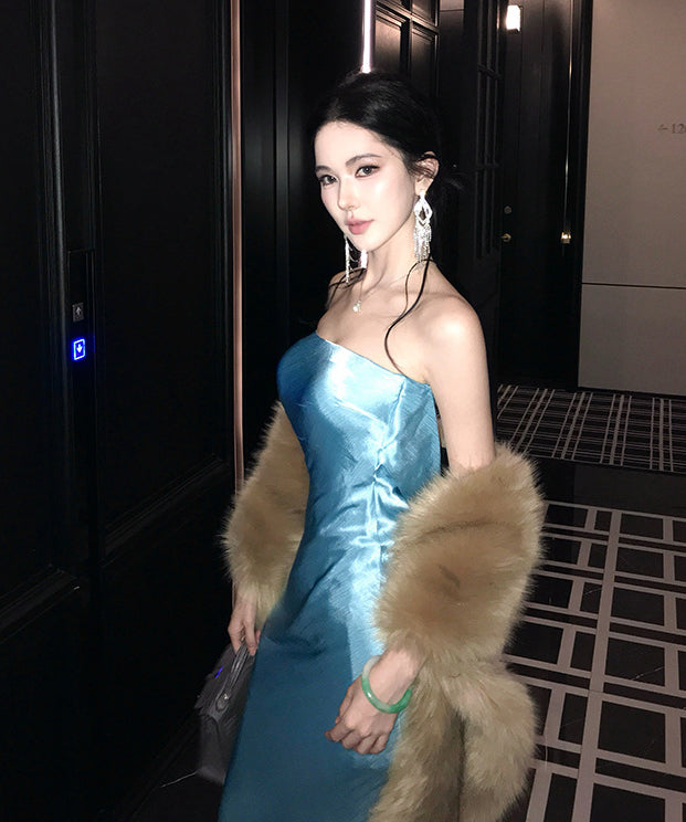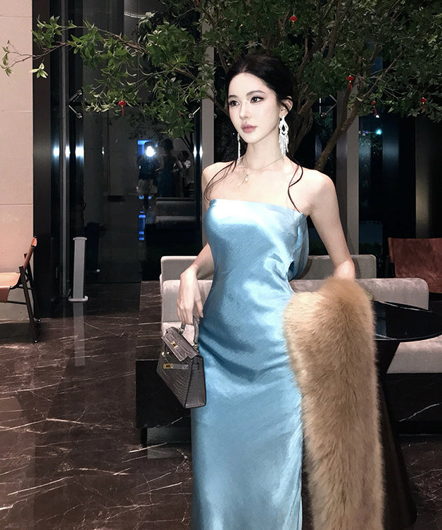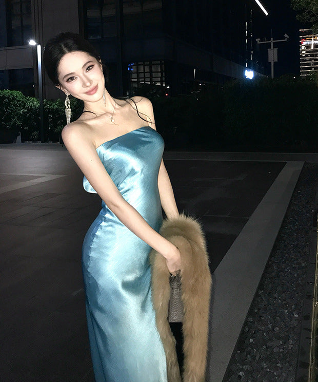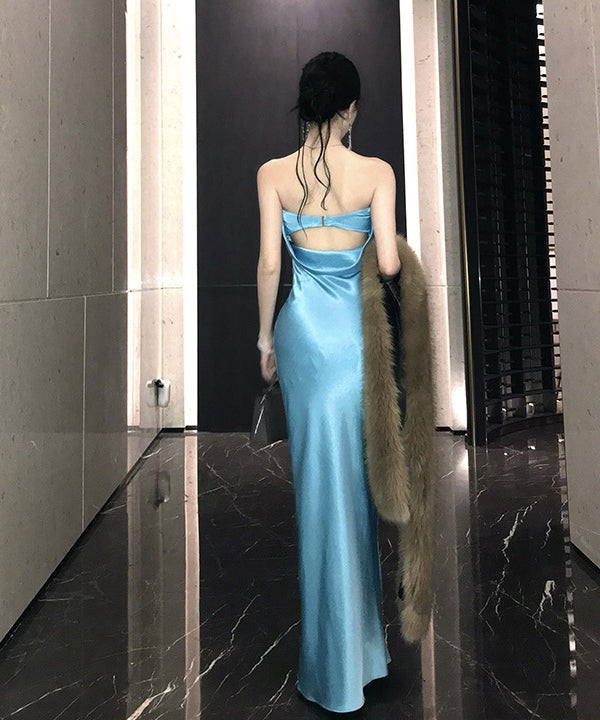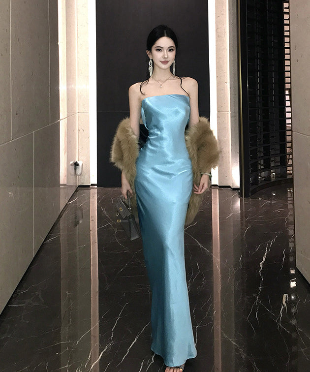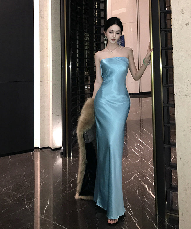 ロングドレス セクシー ベアトップサテン スリムフィット バックレス パーティー イブニング向け JC2-CD3-260-80360580
