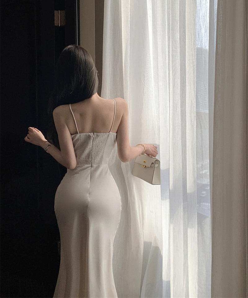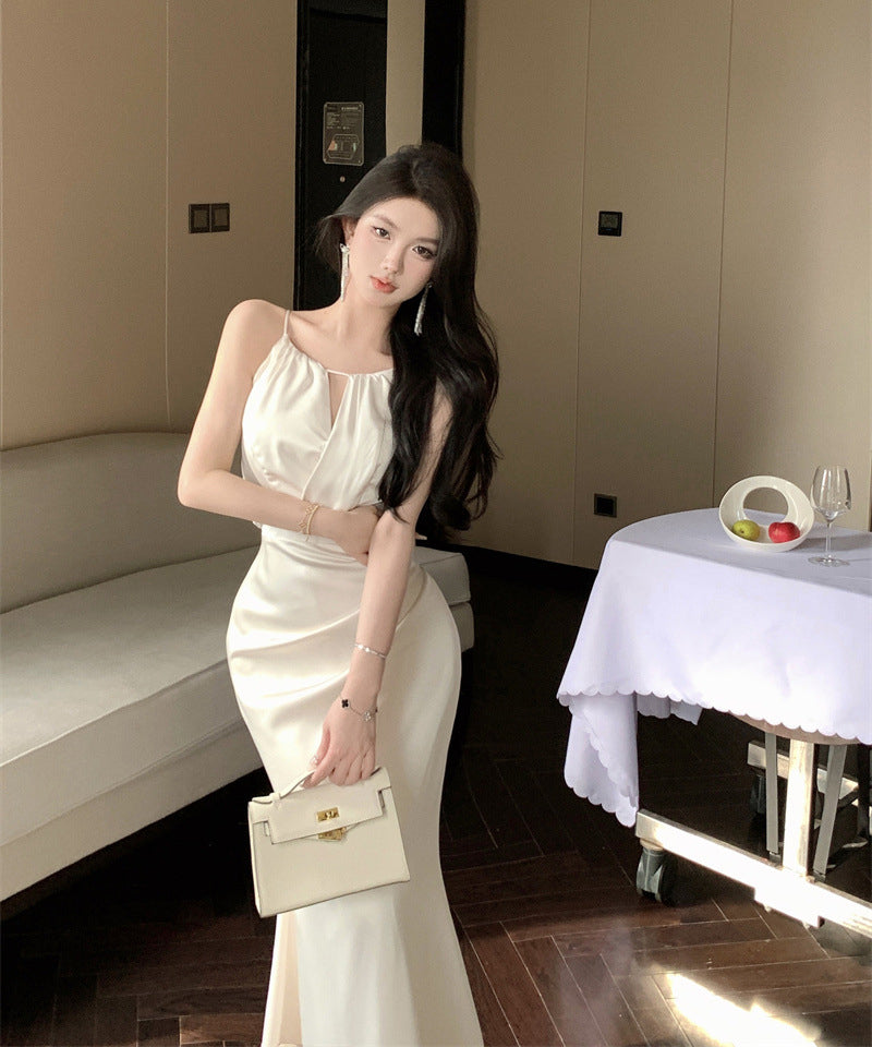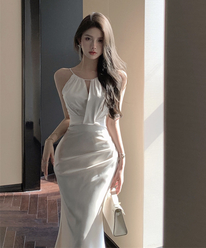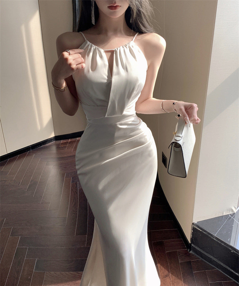 ロングドレス セクシー ホワイトサテン ホルターネック マーメイドロングドレス エレガント 結婚式のお呼ばれ パーティー JC2-XKDD200-0615A-Sep3