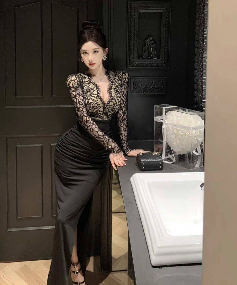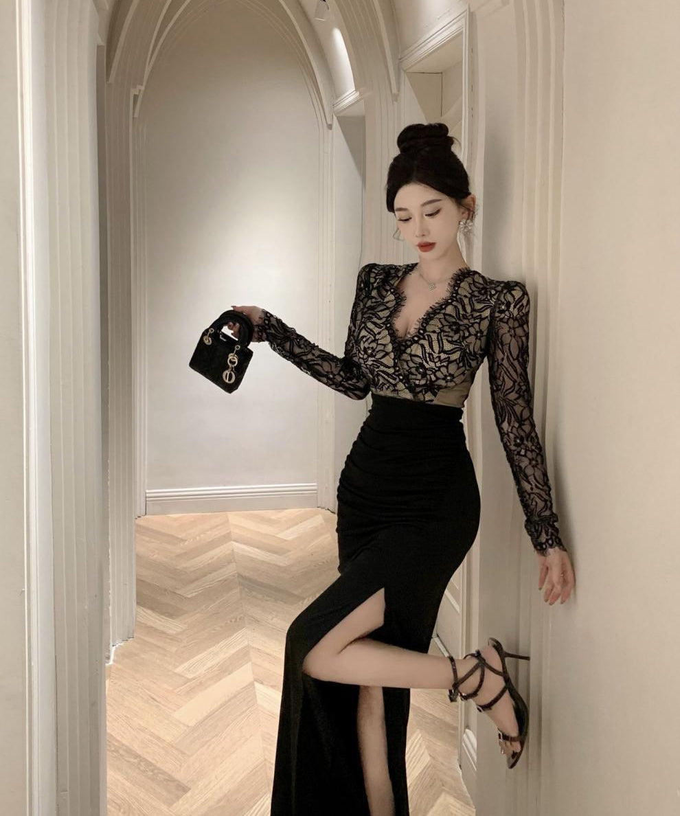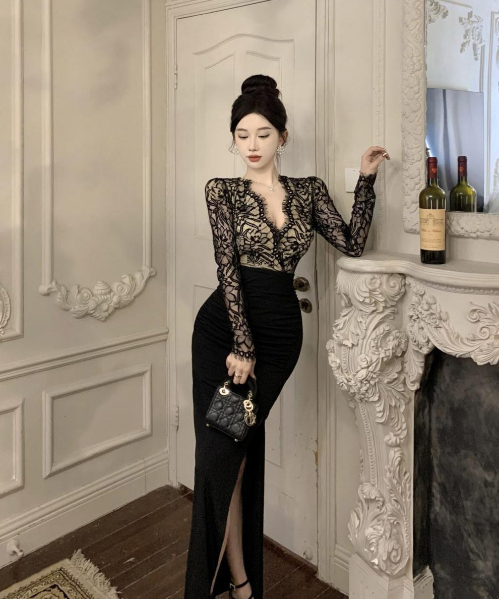 ロングドレス レース マーメイド エレガント 気質 宴会 袖付き Vネック XH2-ZED888300DXH238A