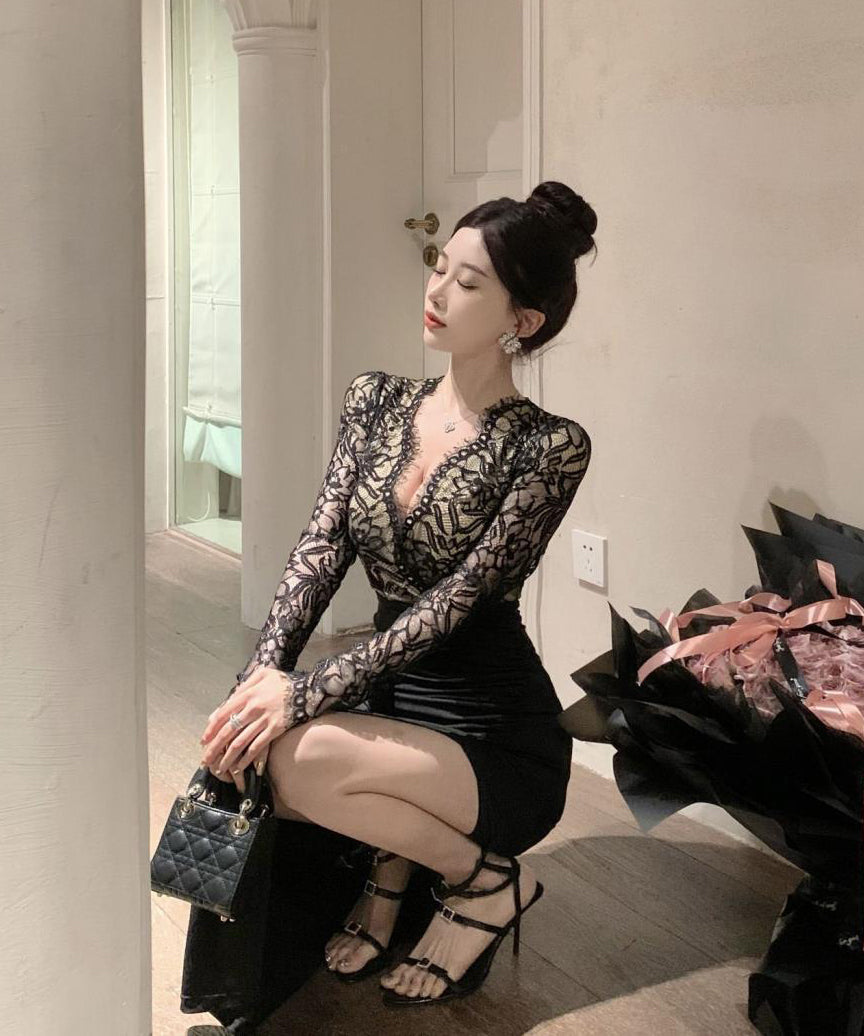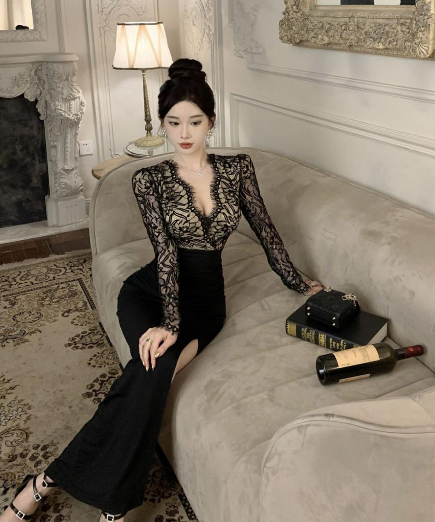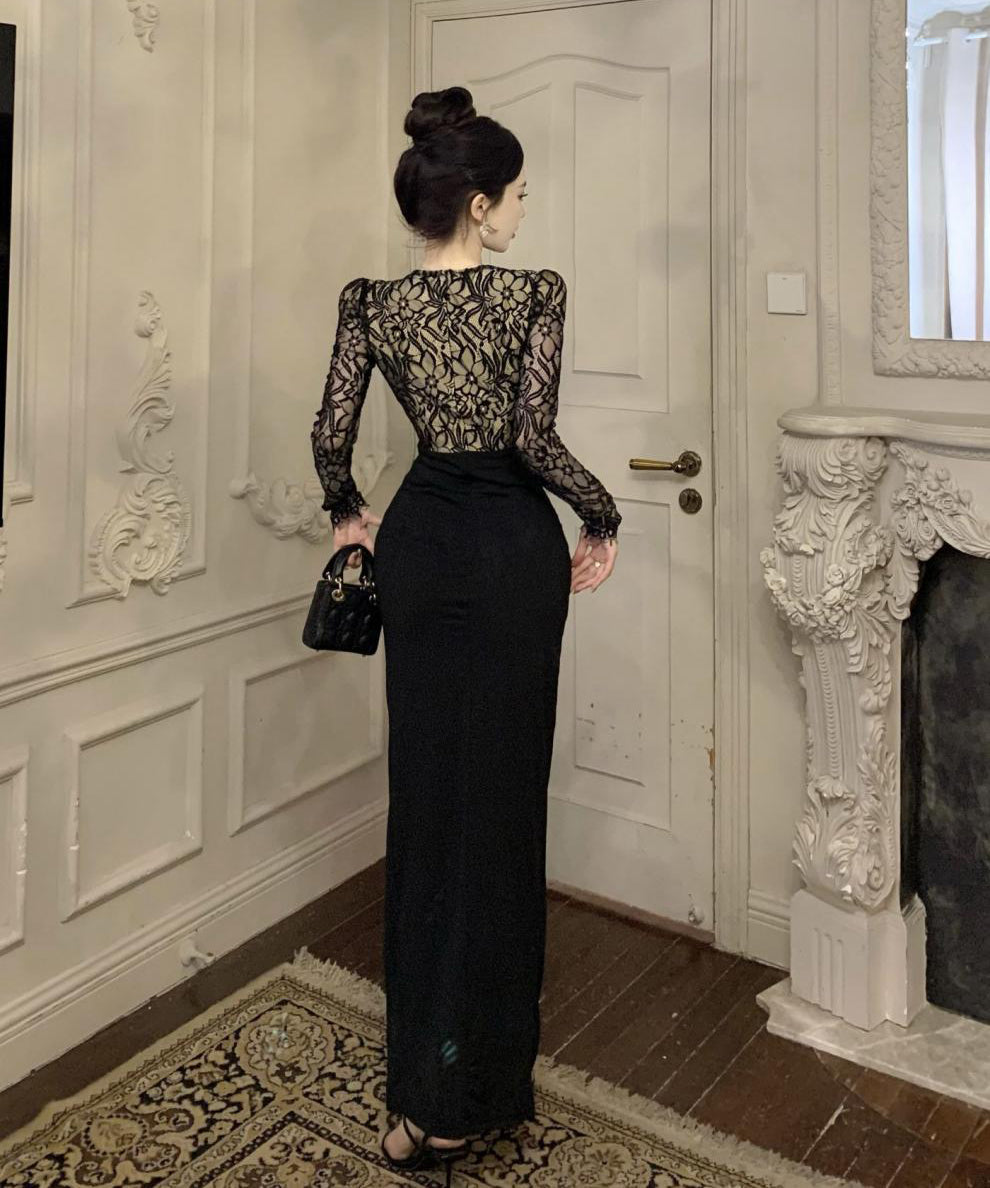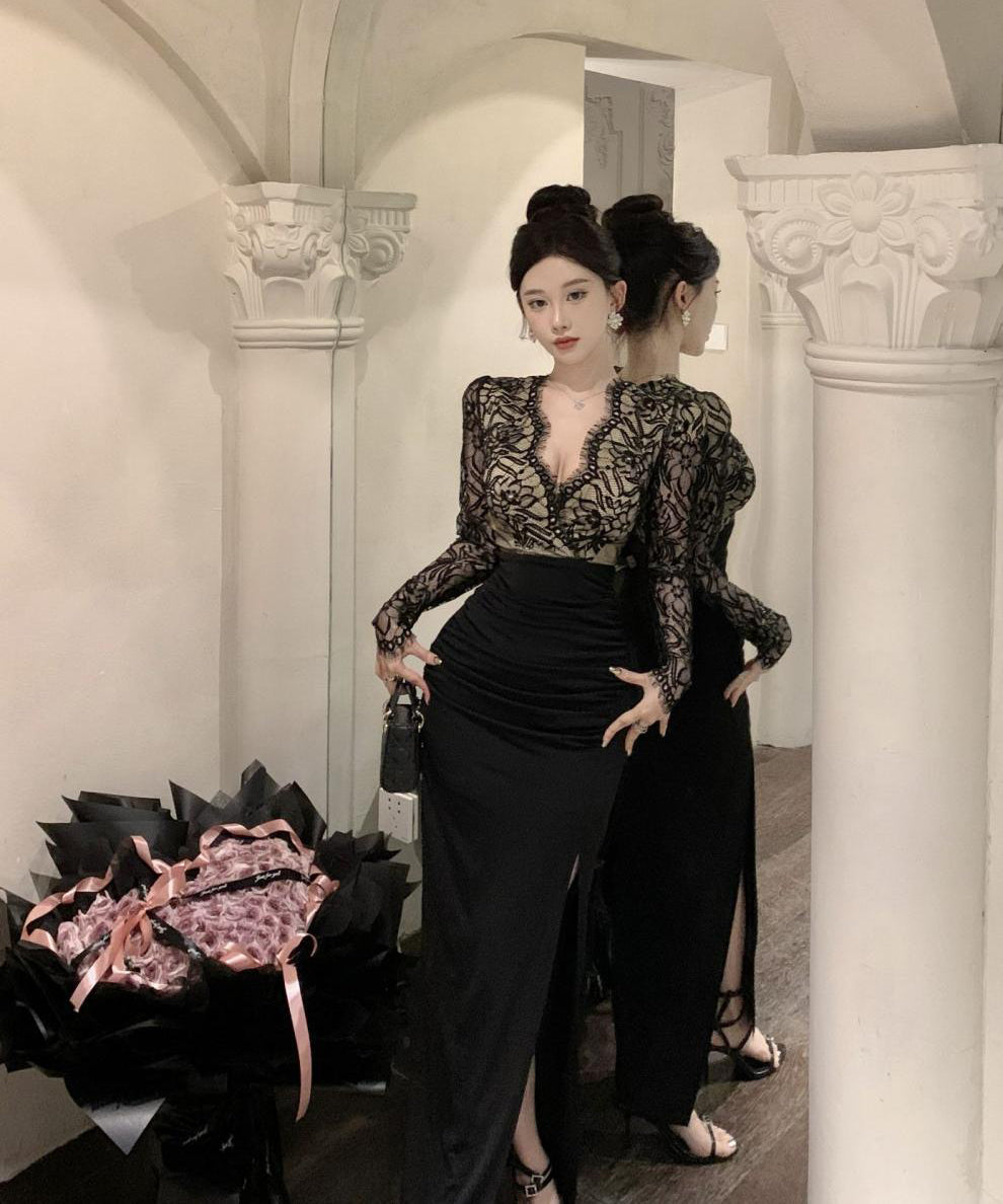 ロングドレス レース マーメイド エレガント 気質 宴会 袖付き Vネック XH2-ZED888300DXH238A