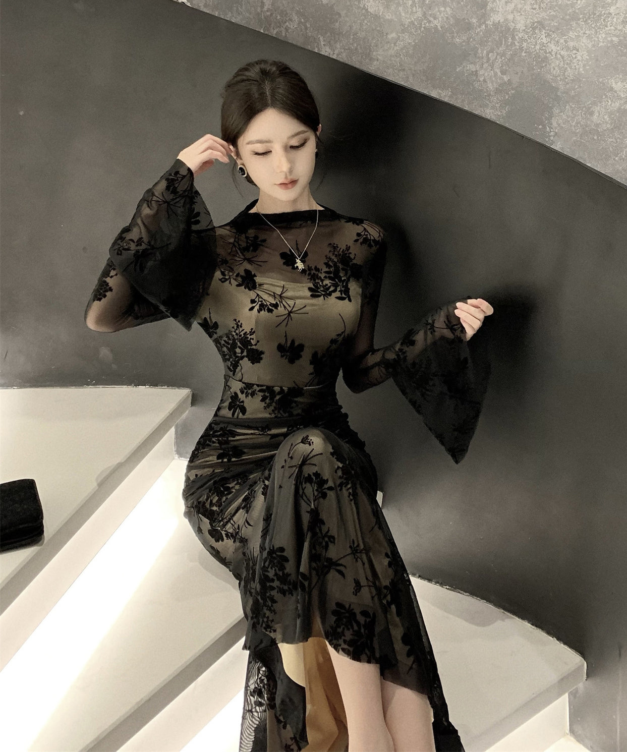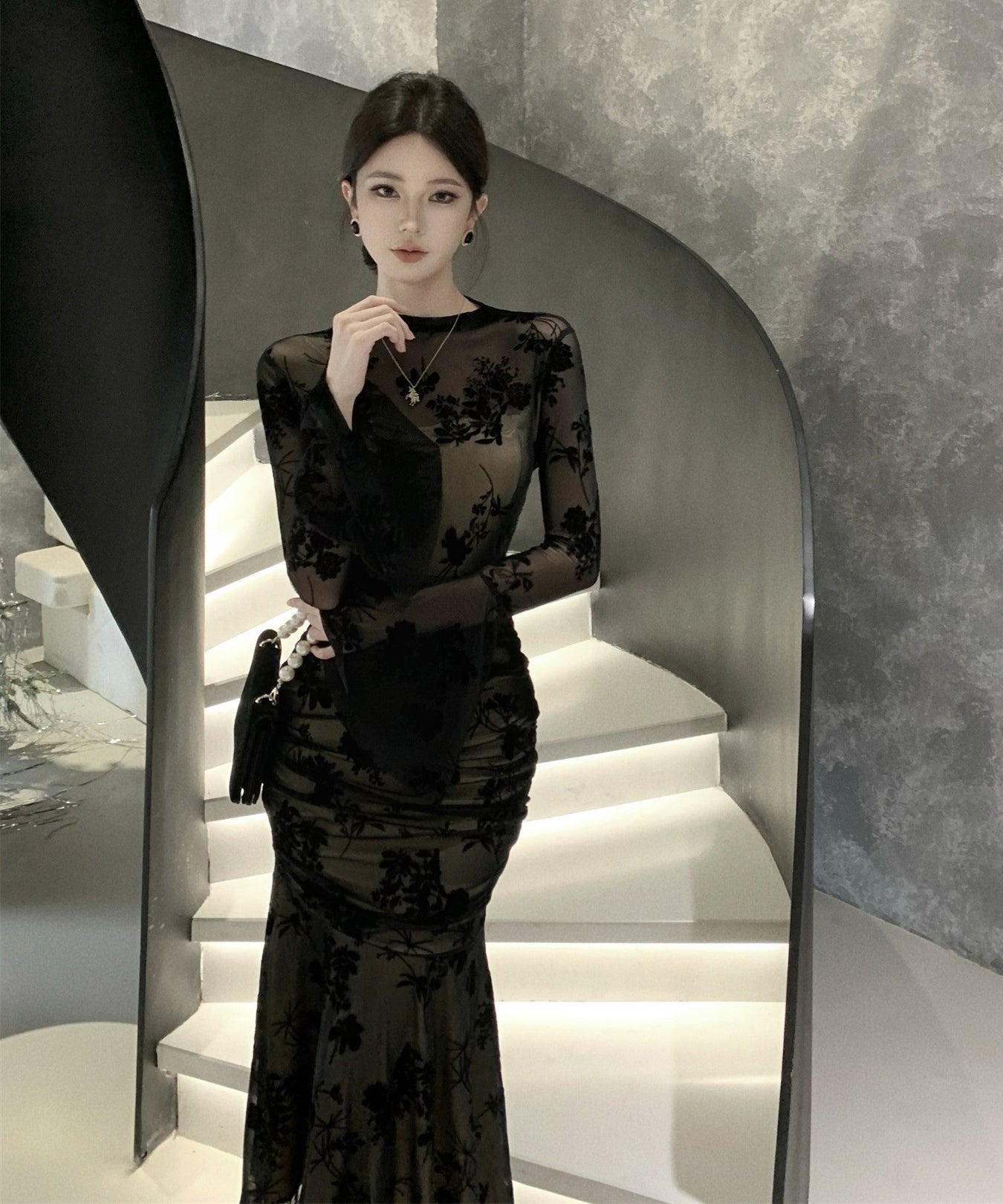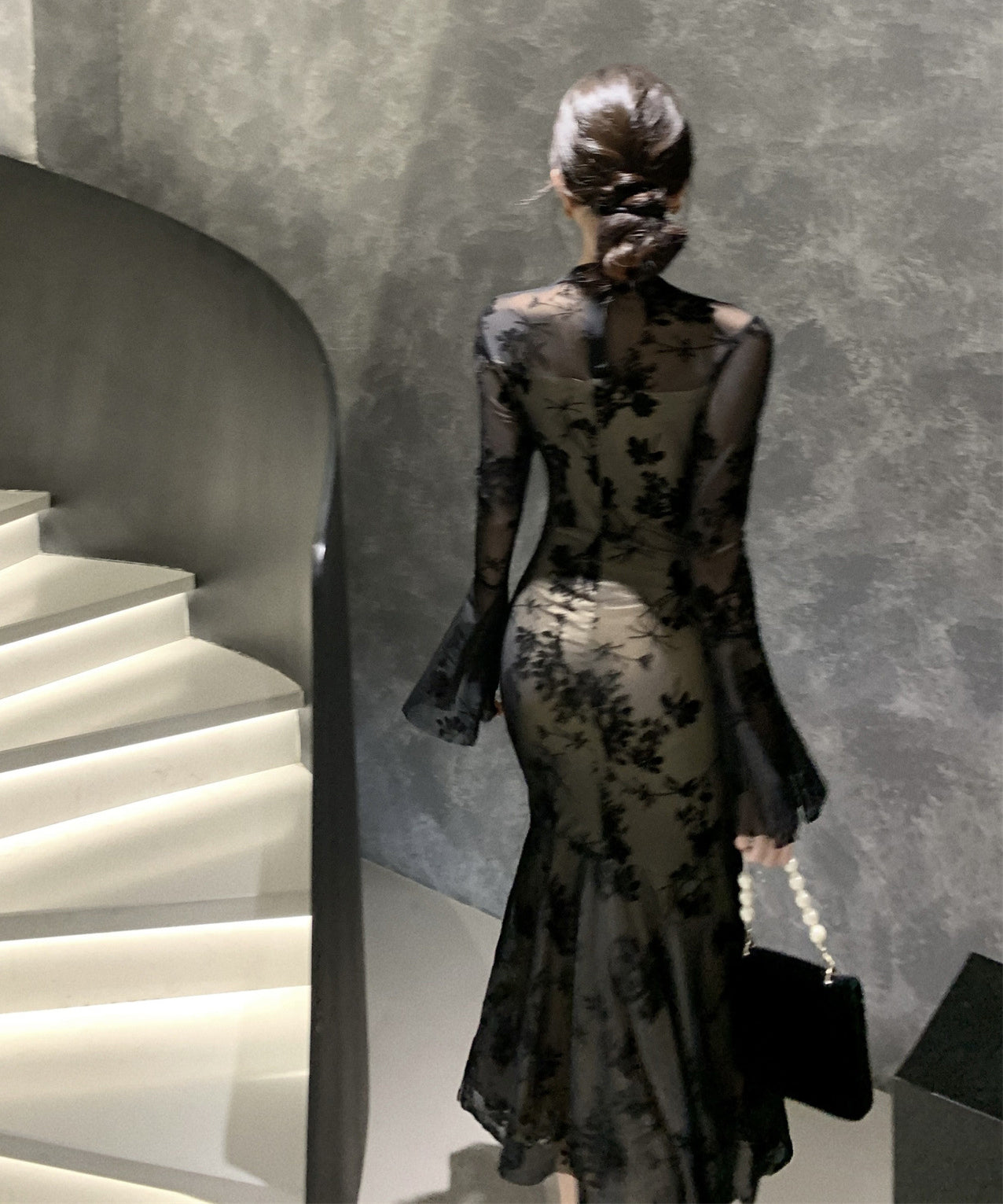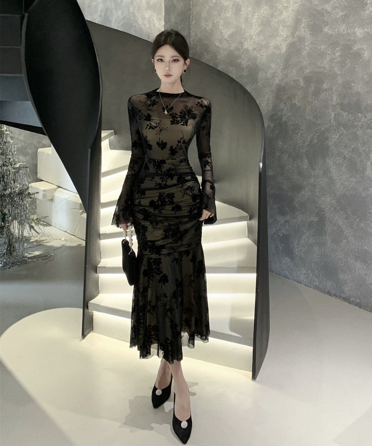 ロングドレス 総レース マーメイド エレガント 気質 宴会 袖付き XH2-DD7231