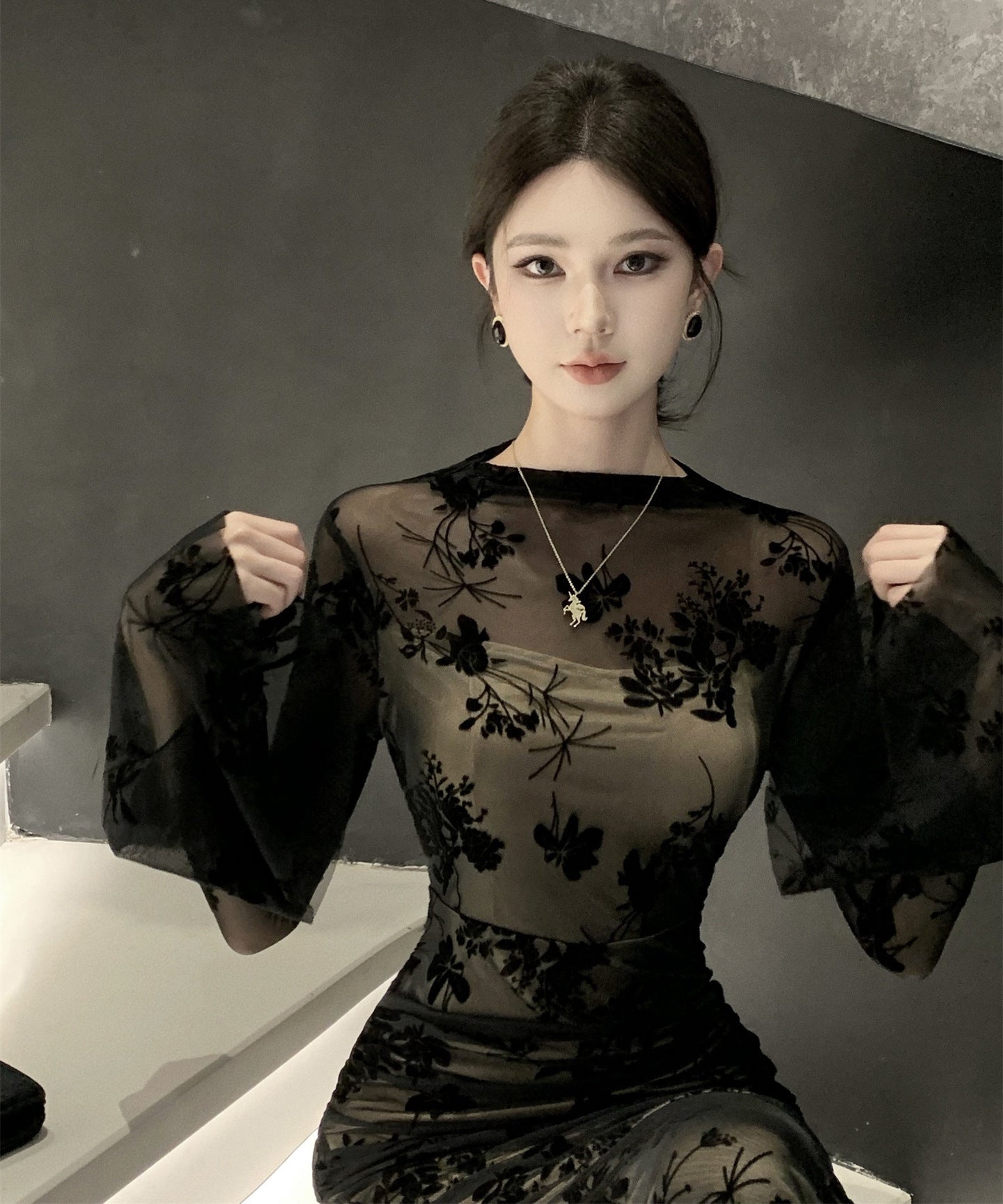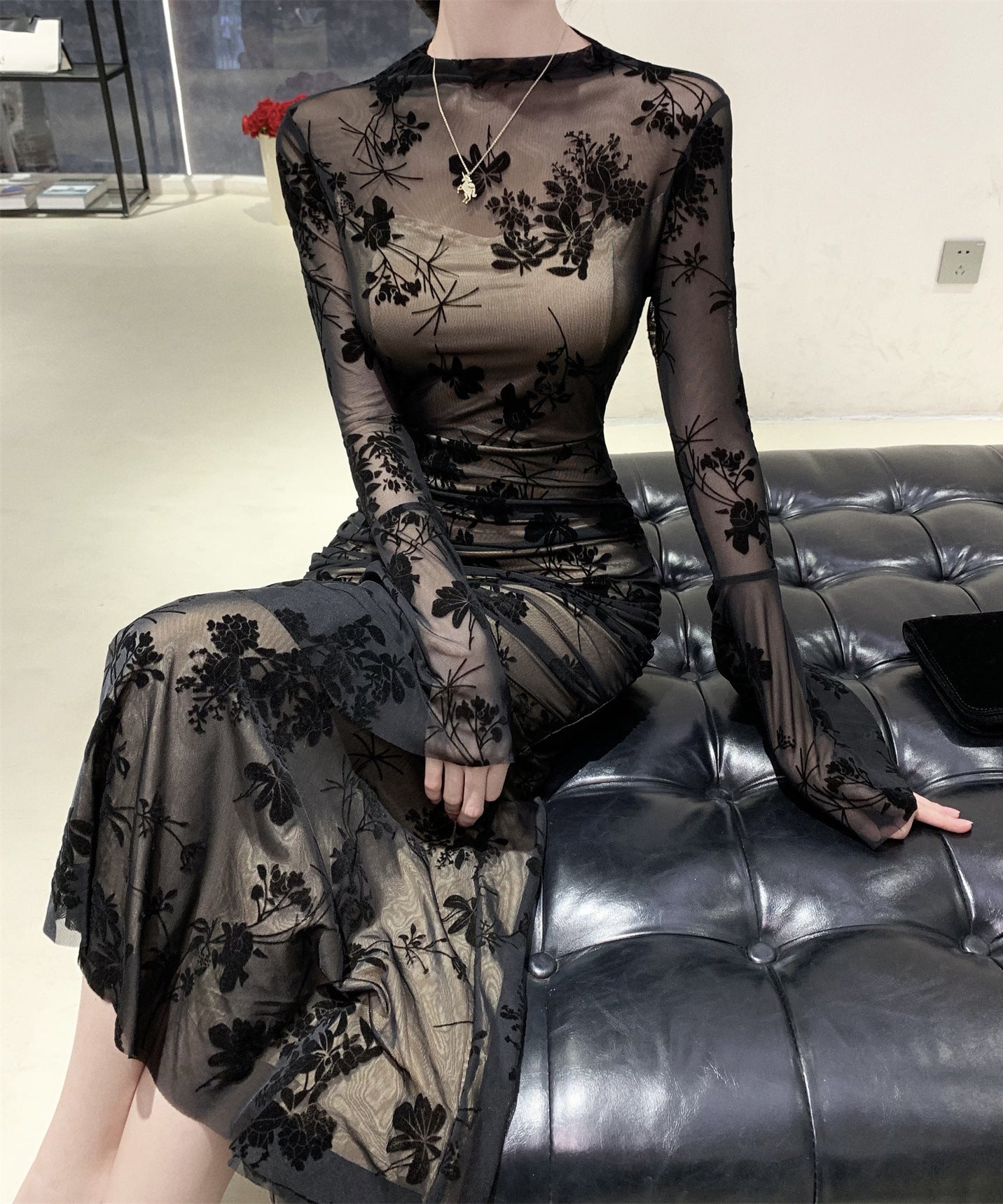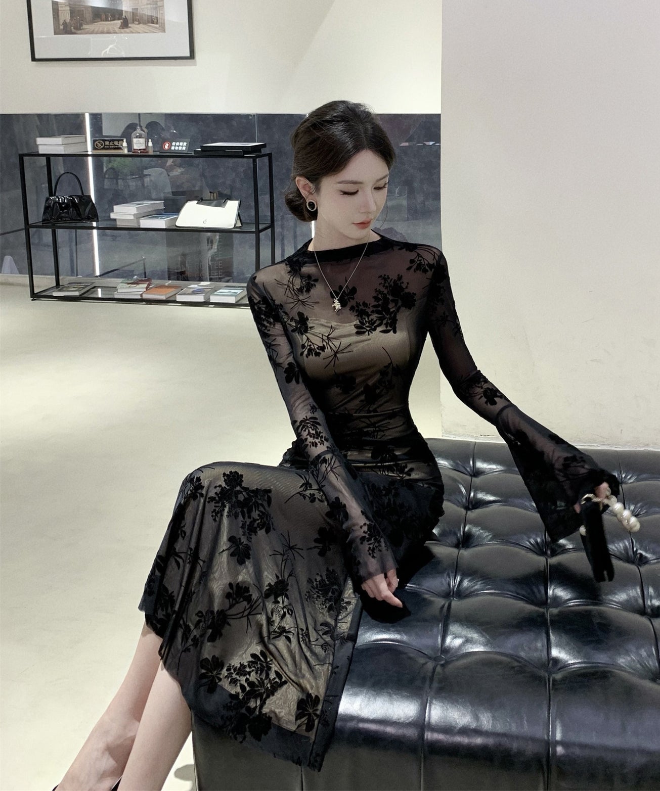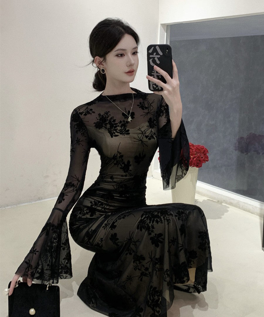 ロングドレス 総レース マーメイド エレガント 気質 宴会 袖付き XH2-DD7231