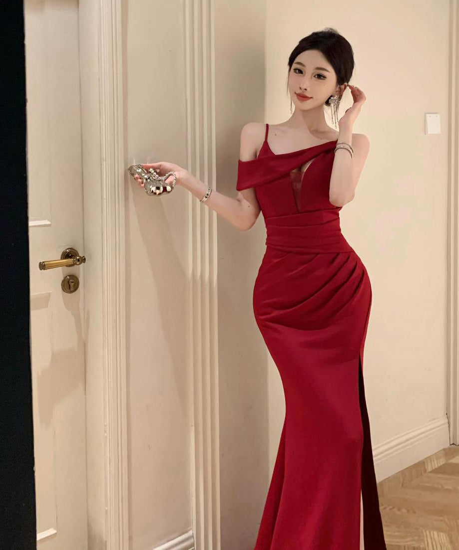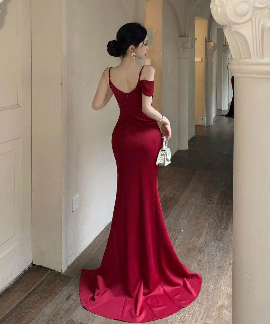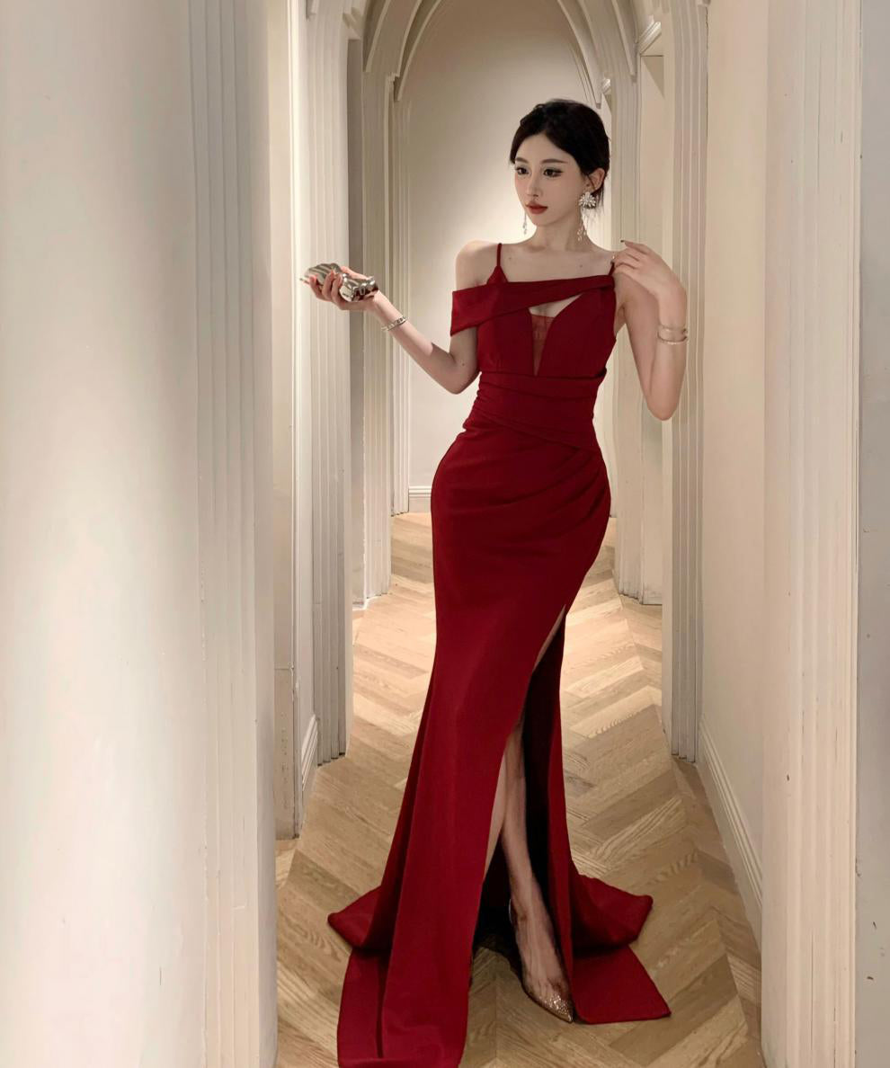 ロングドレス 脚長効果 ワインレッド 宴会 着痩せ 気質 セクシー YH2-ZED888390DXH238A